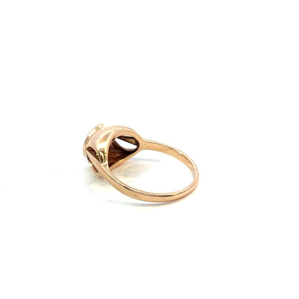 Prsten z růžového zlata o ryzosti 585/1000, punc čejka. Velikost 57,5, váha 3,55 g, rozměr hlavy prstenu 10,5 x 15 mm. Kámen je syntetický.