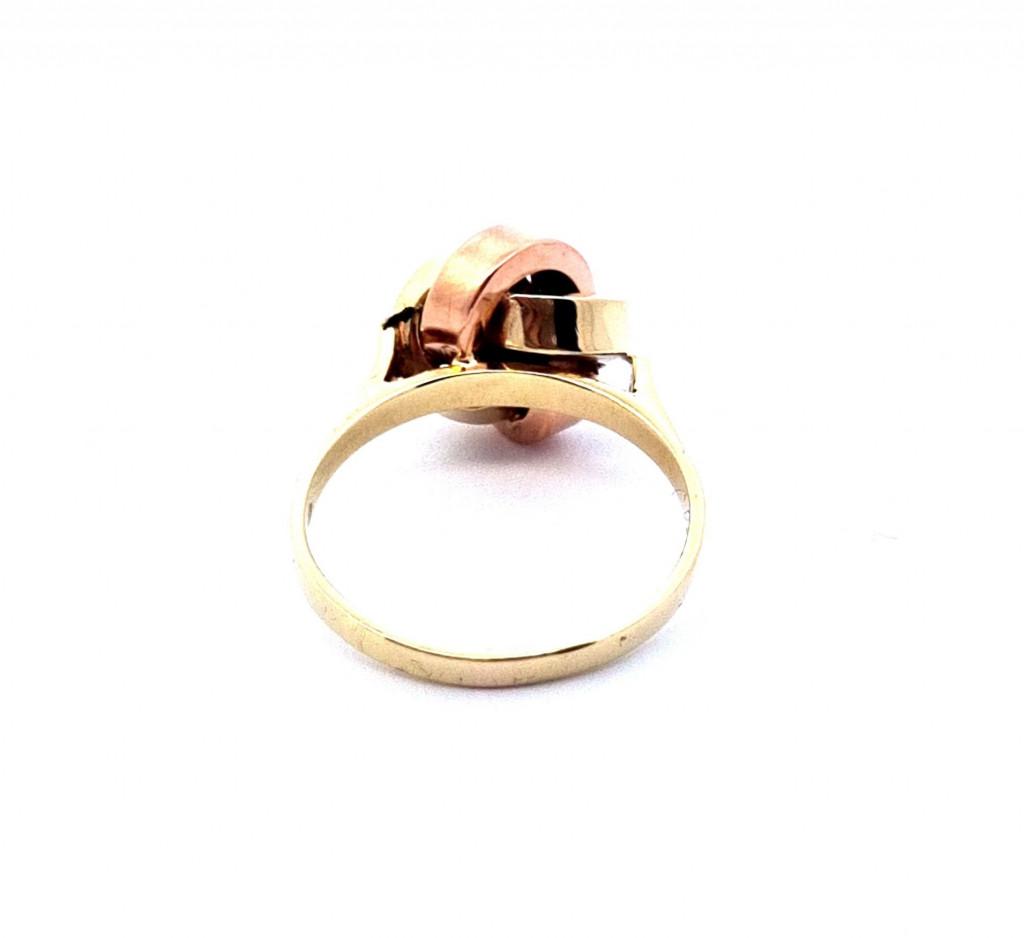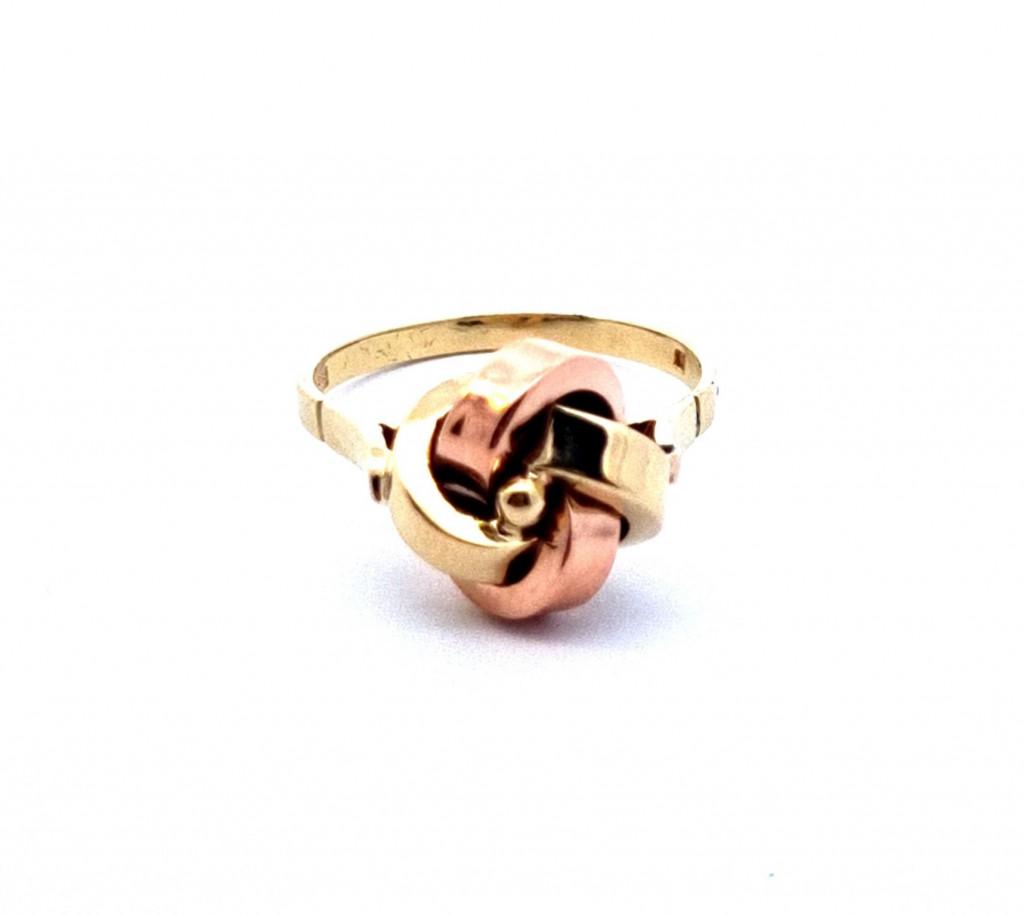 Prsten z kombinace žlutého a růžového zlata o ryzosti 585/1000, punc lvíček. Velikost 55, váha 3,67 g, v nejširším bodě 12 mm.