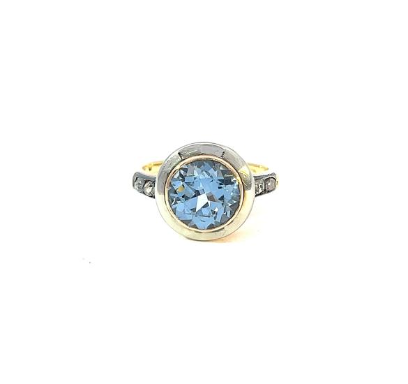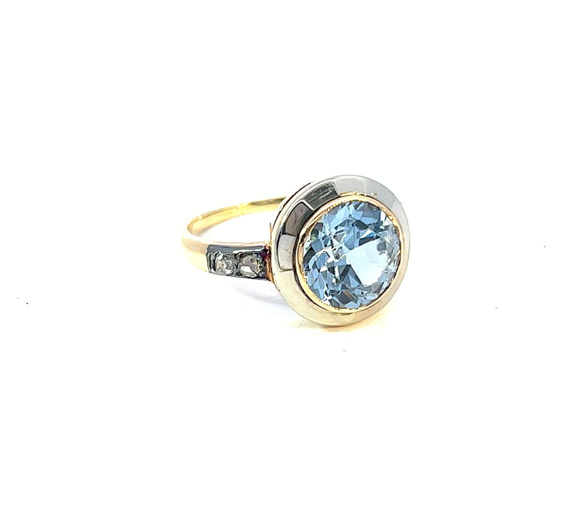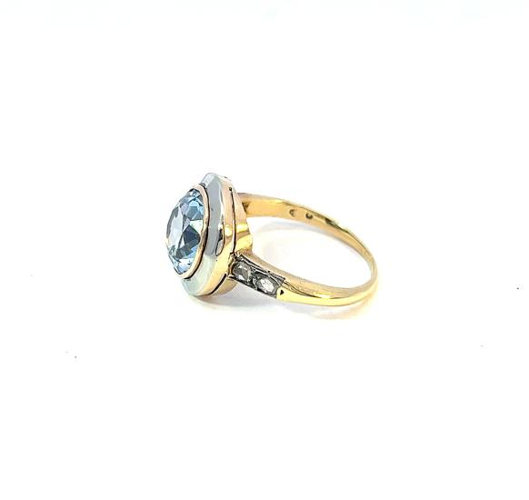 Prsten z kombinace žlutého a bílého zlata o ryzosti 580/1000, punc liška. Velikost 52,5, váha 3,19 g, průměr ozdoby 12,5 mm. Kámen - přírodní diamant routa - 4 ks. Akvamarín je syntetický, má lehce poškozené hrany.