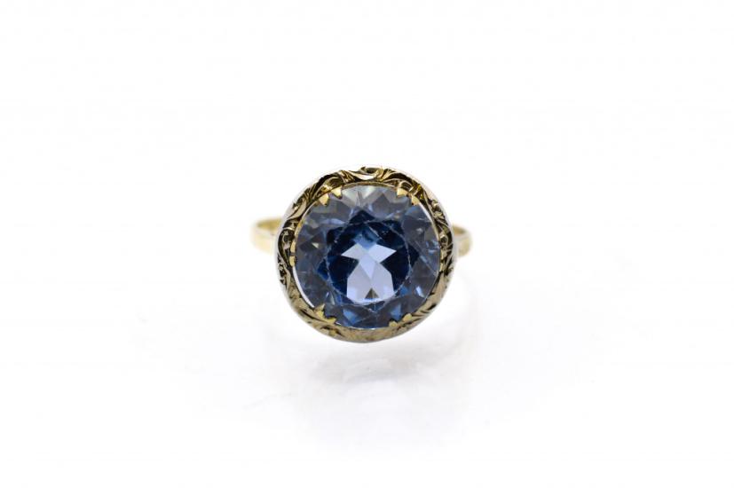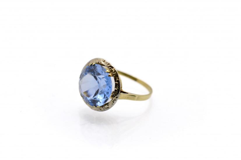 Zlatý prsten o ryzosti 585/1000, punc lvíček. Velikost 53, váha 2,95 g, průměr hlavy prstenu 15 mm. Kámen je syntetický a lehce kloktá.