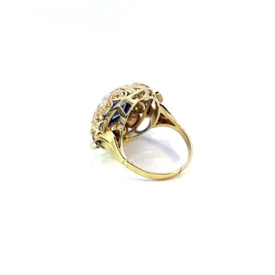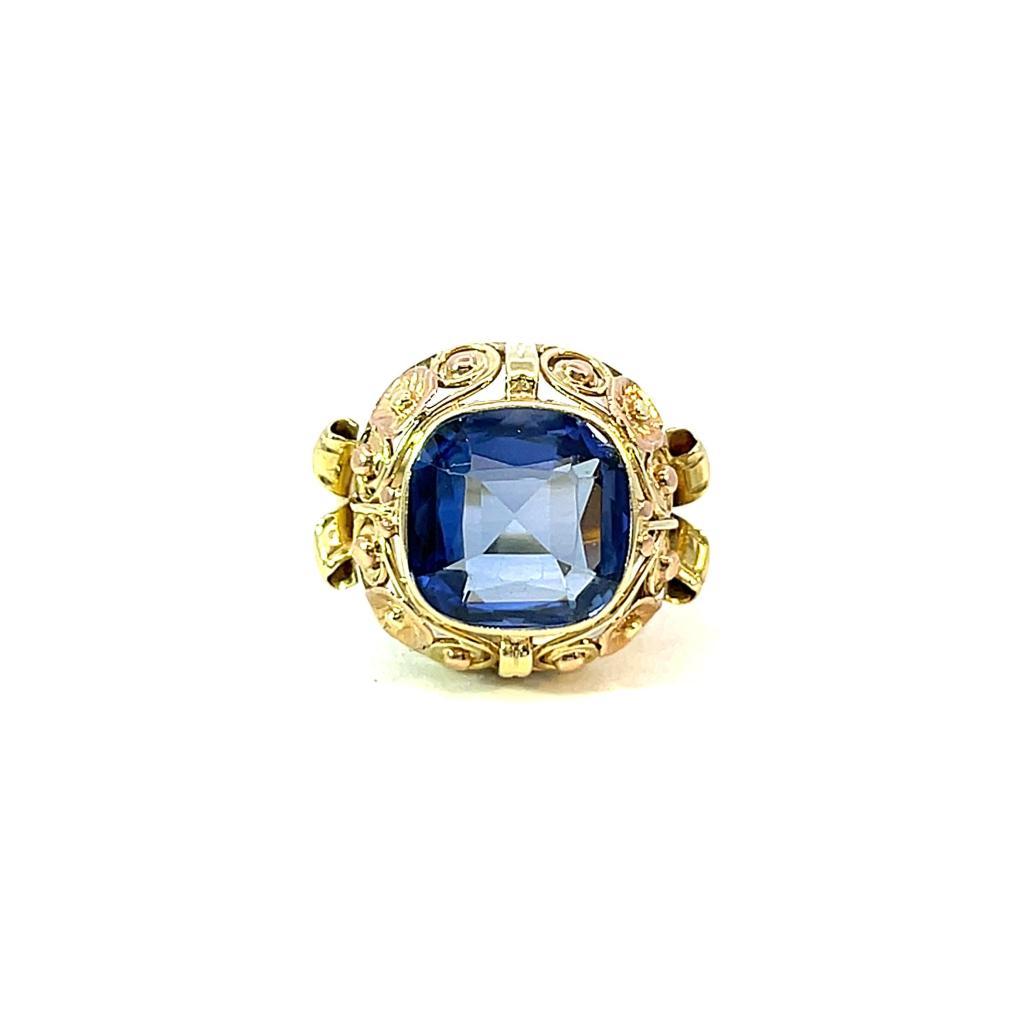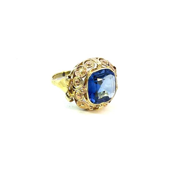 Prsten z kombinace žlutého a růžového zlata o ryzosti 585/1000, punc lvíček. Velikost 55, váha 6,36 g, rozměr hlavy prstenu 19 x 22,5 mm. Kámen je syntetický, v jednom rohu je kousek kamene uštípnutý. Uprostřed šíny je tmavé místo - stopy po opravě.