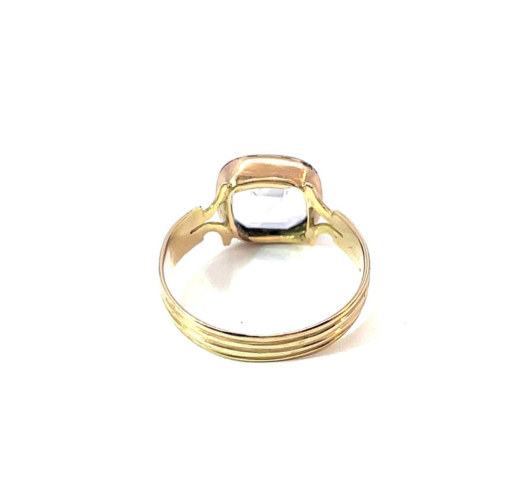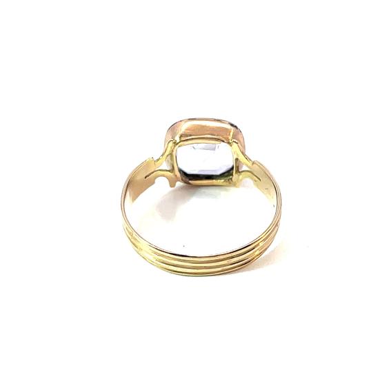 Prsten z růžového zlata o ryzosti 580/1000, punc liška. Velikost 54, váha 3,35 g, rozměr hlavy prstenu 12 x 12 mm. Kámen je syntetický. Kolem kamene má zlato tmavou barvu. Kámen nese známky opotřebení.