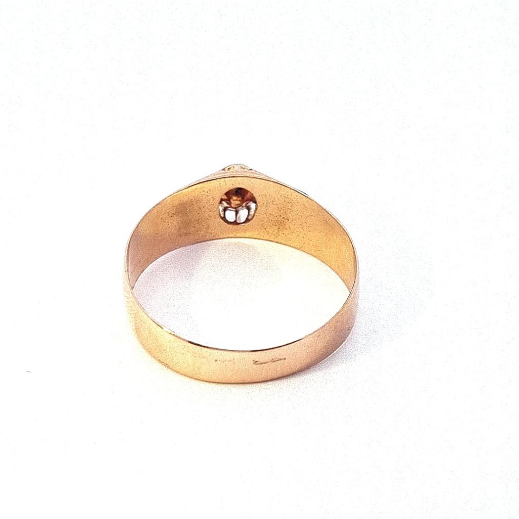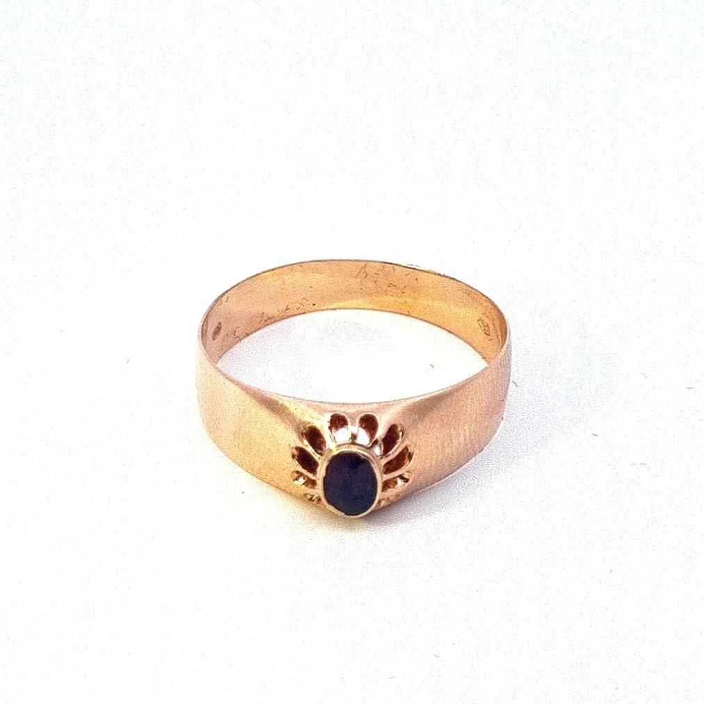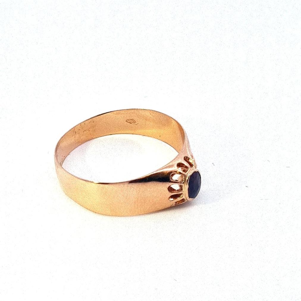 Zlatý prsten o ryzosti 580/1000, punc liška, váha 3,74 g, velikost 65, v nejširším bodě 7 mm, rozměry kamene - výška 5 mm, šířka 3 mm.