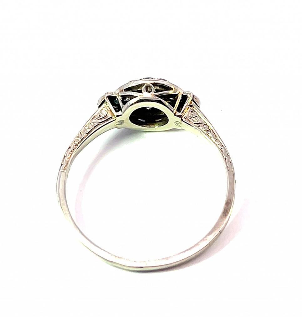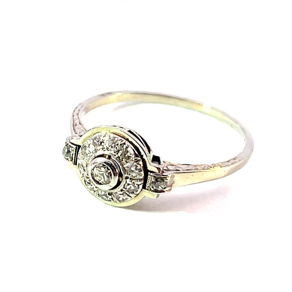Prsten z bílého zlata o ryzosti 585/1000, punc lvíček. Velikost 56, váha 2,22 g, v nejširším bodě 9 mm. Centrální kámen - přírodní diamant staroevropského brusu - 1 ks, cca 0,05 ct.
