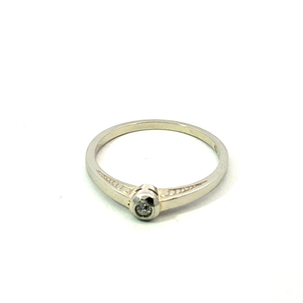 Prsten z bílého zlata o ryzosti 585/1000, punc lvíček. Velikost 54, váha 1,81 g, v nejširším bodě 4 mm. Kámen - přírodní diamant staroevropského brusu - 1 ks, cca 0,04 ct.