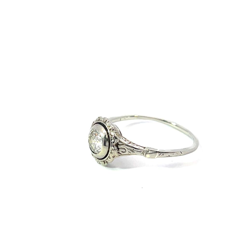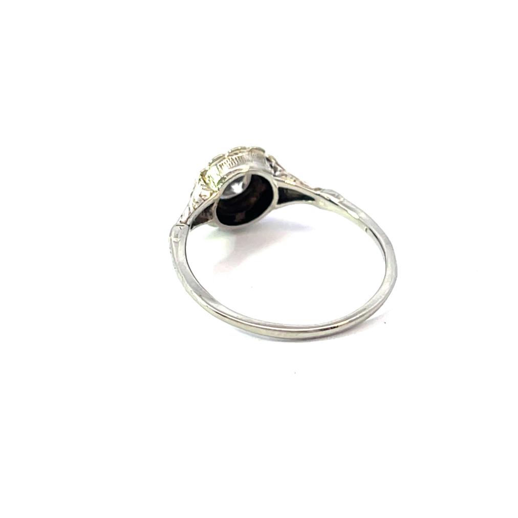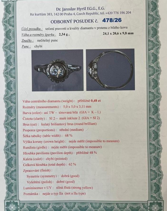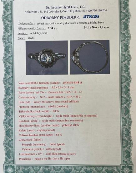 Prsten z bílého zlata o ryzosti 585/1000, punc lvíček. Váha 2,34 g, velikost 57, průměr ozdoby 9,5 mm. Kámen - přírodní diamant briliantového brusu - 1 ks, barva: TW, čistota: SI 2, cca 0,48 ct.