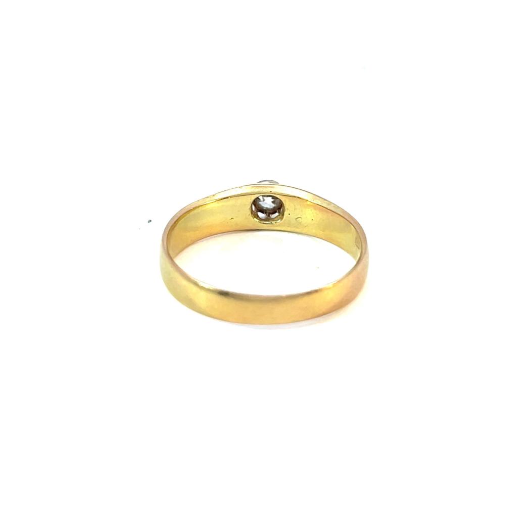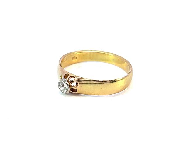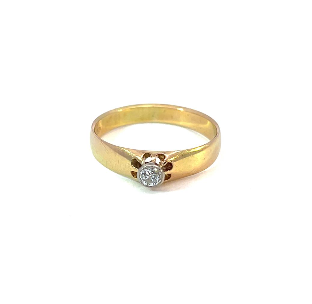 Zlatý prsten o ryzosti 580/1000, punc liška. Velikost 55,5, váha 2,79 g, v nějširším bodě 5 mm. Kámen - přírodní diamant staroevropského brusu - 1 ks, cca 0,10 ct.