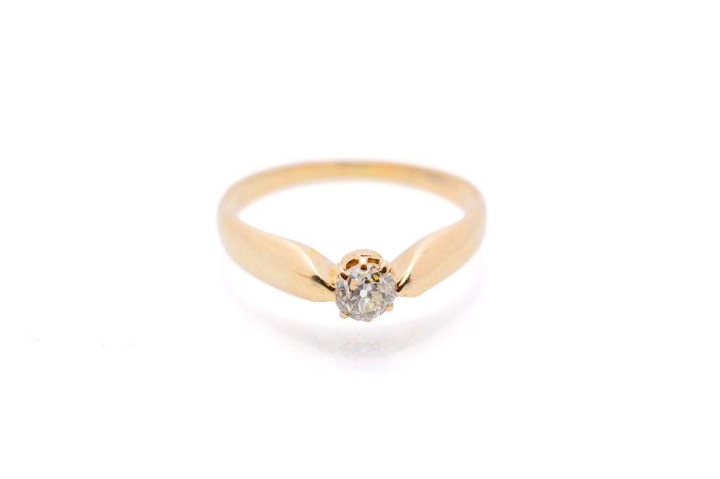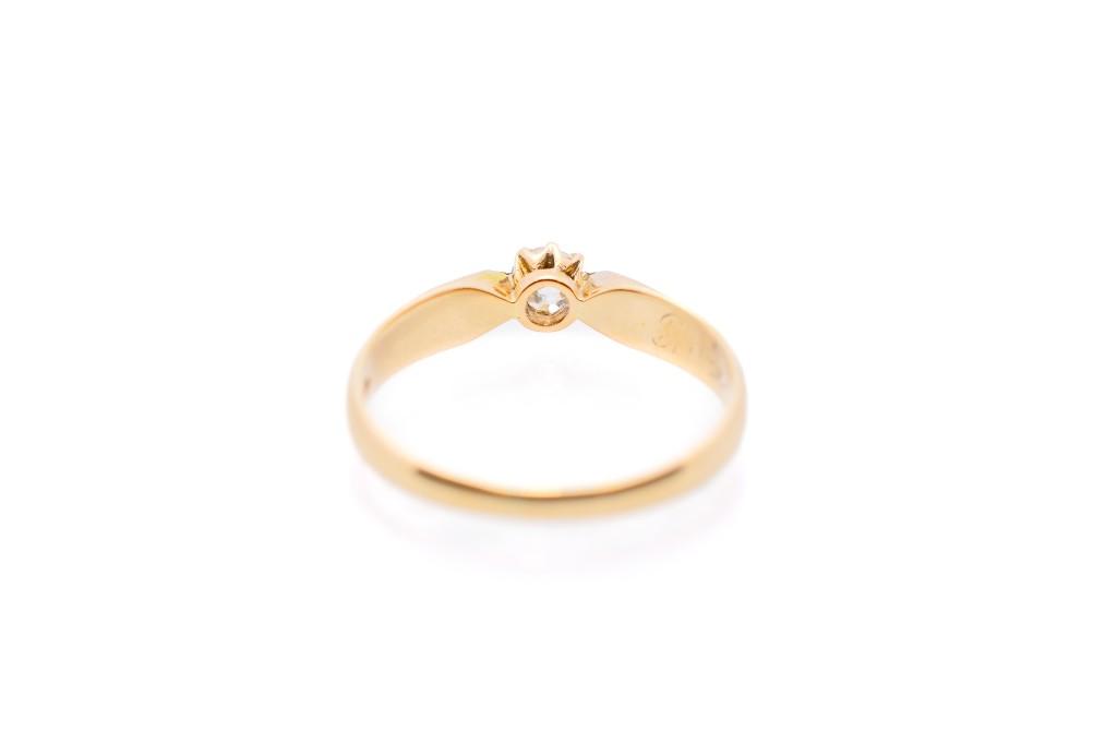 Starožitný zlatý prsten o ryzosti 585/1000, punc liška, váha 2,08g, vel. 53. Kámen přírodní diamant, staroevropský brus, cca 0,2 ct.