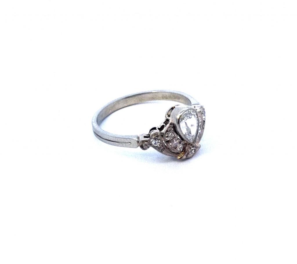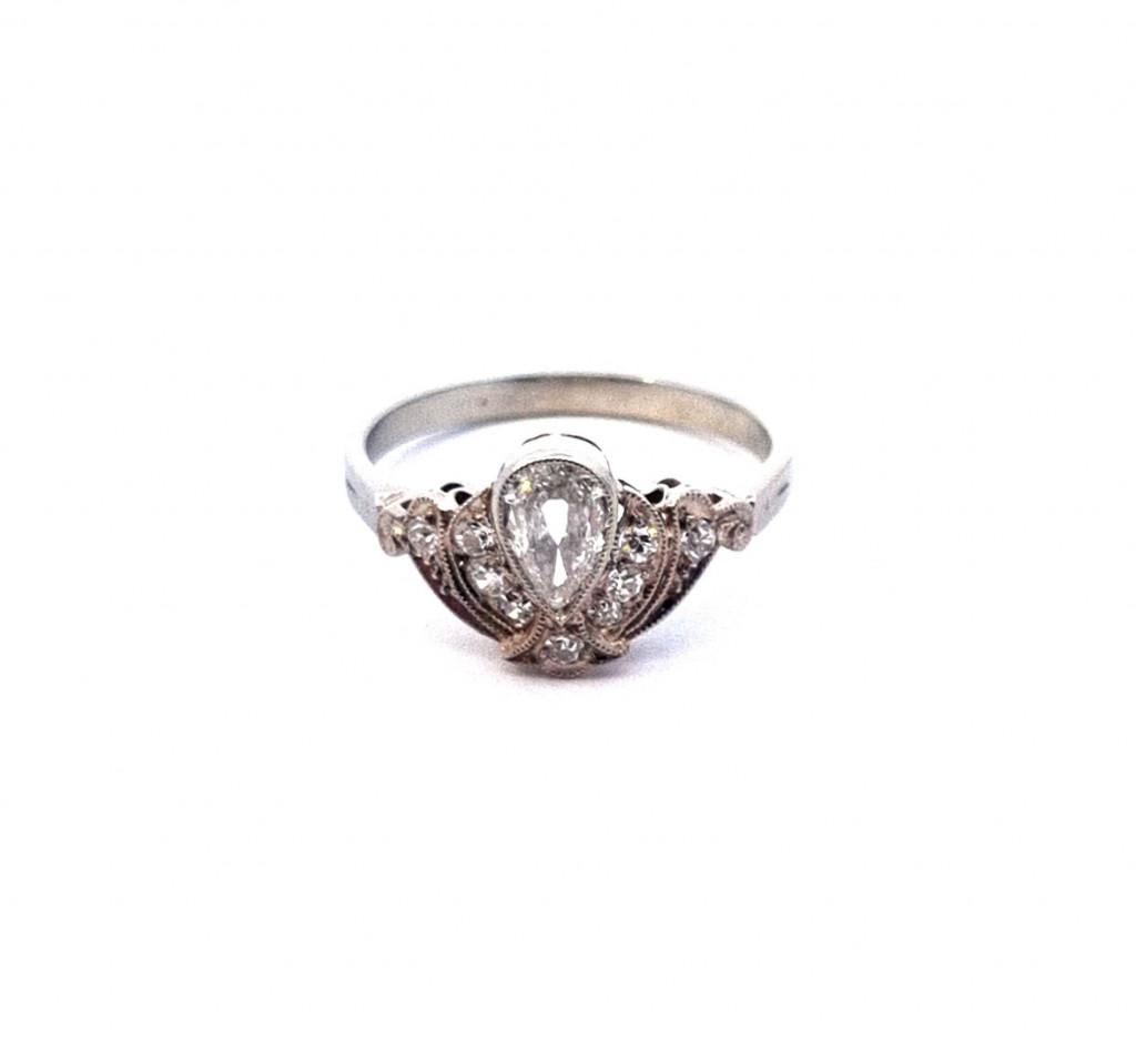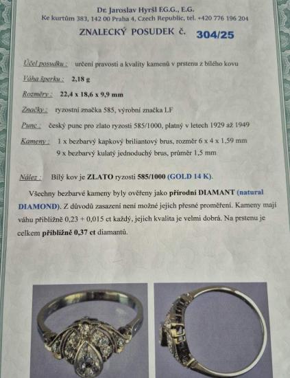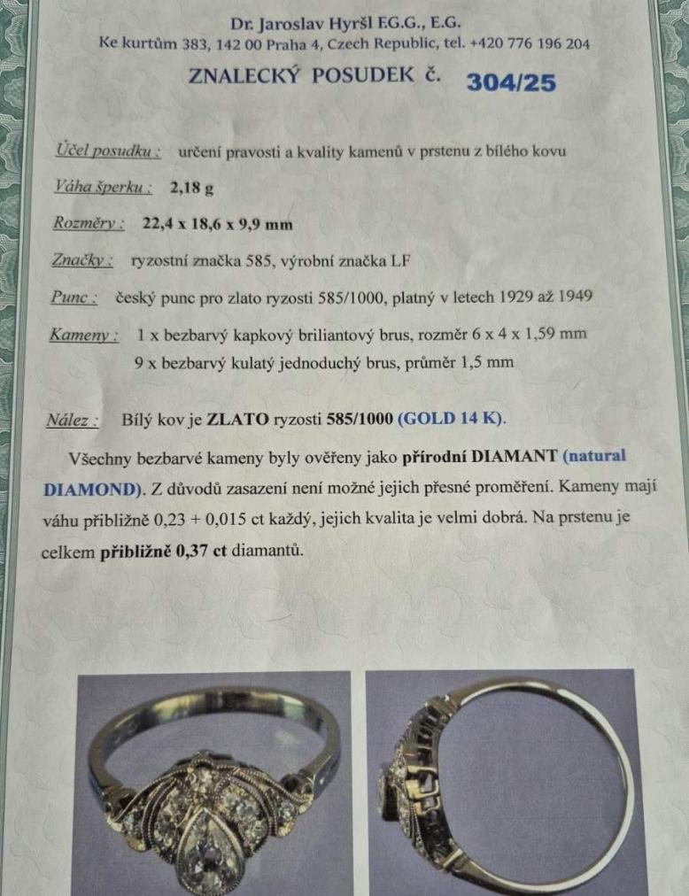Prsten z bílého zlata o ryzosti 585/1000, punc lvíček. Velikost 52, váha 2,18 g, v nejširším bodě 10 mm. Kámen - přírodní diamant kapkového briliantového brusu - 1 ks, cca 0,23 ct. Kámen - přírodní diamant kulatý jednoduchý brus - 9 ks, cca 0,015 ct každý. Na prstenu je celkem cca 0,37 ct.