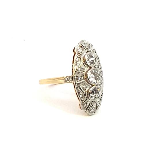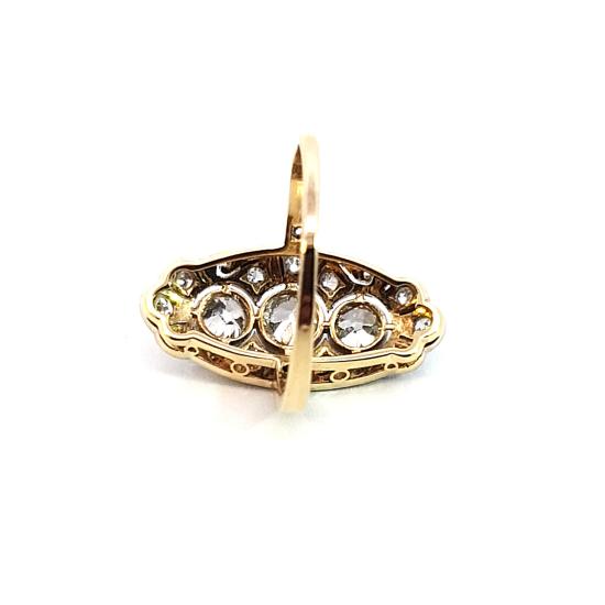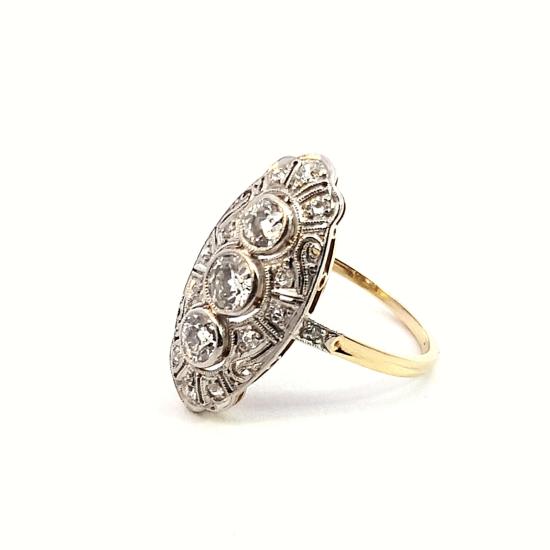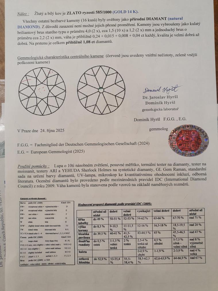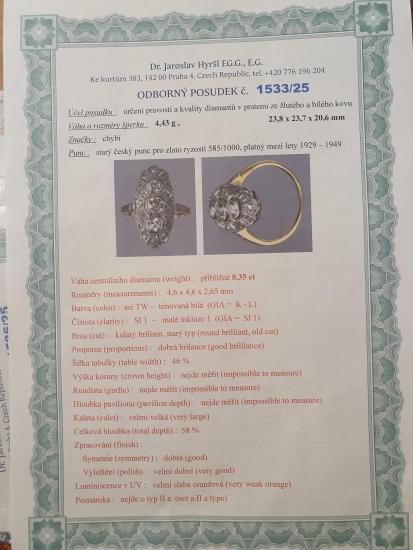 Prsten z kombinace žlutého a bílého zlata o ryzosti 585/1000, punc lvíček. Velikost 55,5, váha 4,43 g, rozměr hlavy prstenu 24 x 12 mm. Kámen - přírodní diamant staroevropského (14 ks) a jednoduchého (2 ks) brusu. Centrální diamant má cca 0,35 ct, celkem je na prstenu cca 1,08 ct diamantů - viz. odborný posudek.