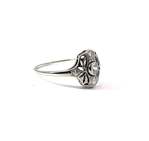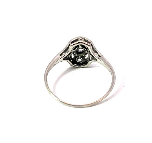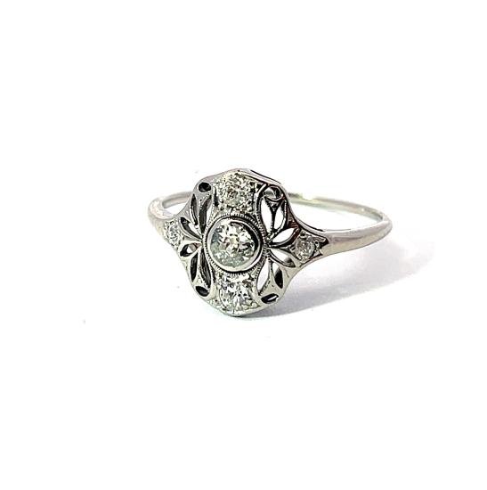 Prsten z bílého zlata o ryzosti 585/1000, punc klas (punc používaný od roku 1949). Velikost 56, váha 1,98 g, rozměr hlavy prstenu 13 x 11,5 mm. Kámen - přírodní diamant staroevropského brusu - 4 ks, centrální kámen: 1 ks, cca 0,15 ct - dohromady cca 0,34 ct. Jeden z diamantů nahrazen leukosafírem.