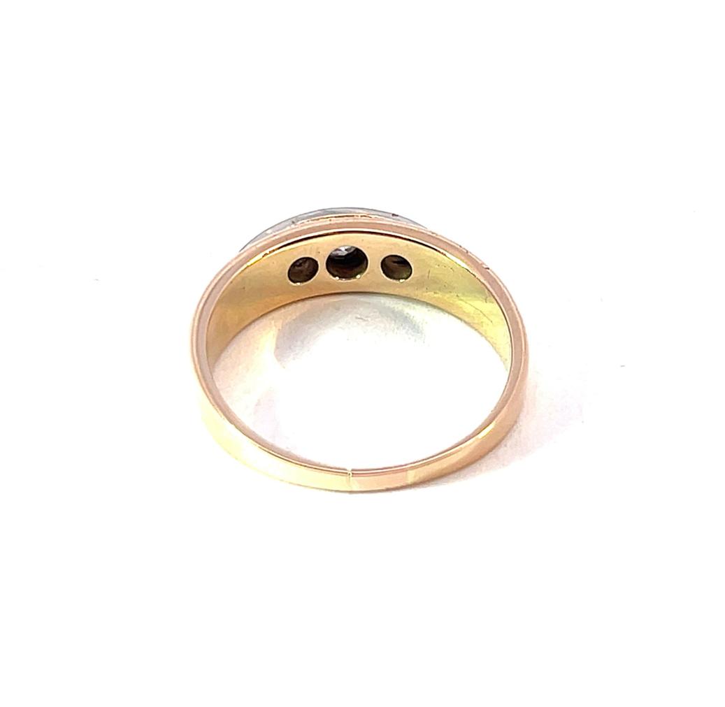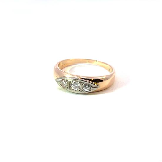 Prsten z kombinace růžového a bílého zlata o ryzosti 585/1000, zbytek puncu liška a punc klas + ryz. číslo. Velikost 58,5, váha 4,62 g, v nejširším bodě 5,5 mm. Kámen - přírodní diamant staroevropského brusu - 3 ks, centrální kámen: 1 ks, cca 0,10 ct, ostatní kameny: 2 ks, cca 0,07 ct - dohromady cca 0,24 ct.