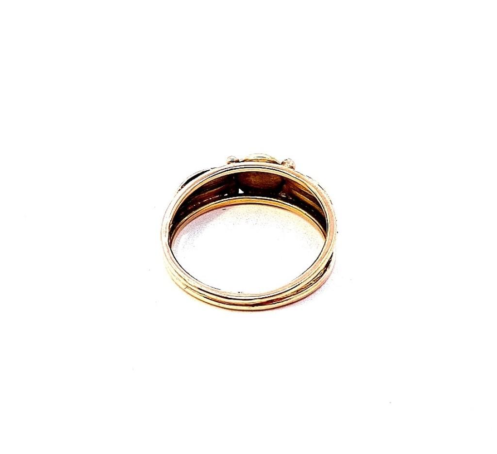 Zlatý prsten o ryzosti 585/1000, punc lyra , váha 2,53 g, velikost 54, v nejširším bodě 6 mm, průměr kamene - 5 mm.