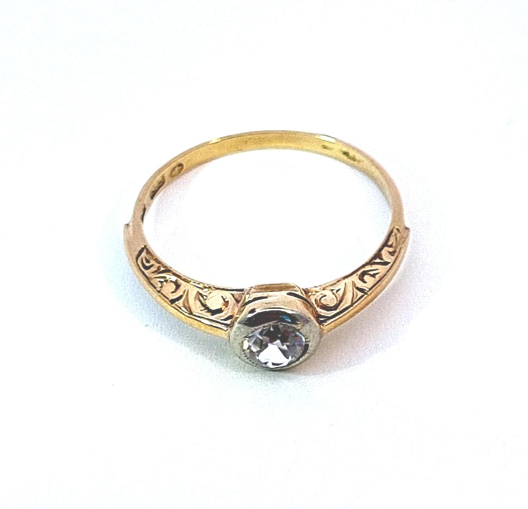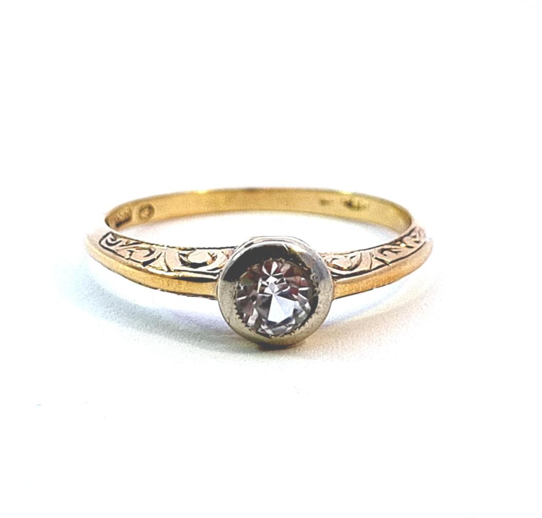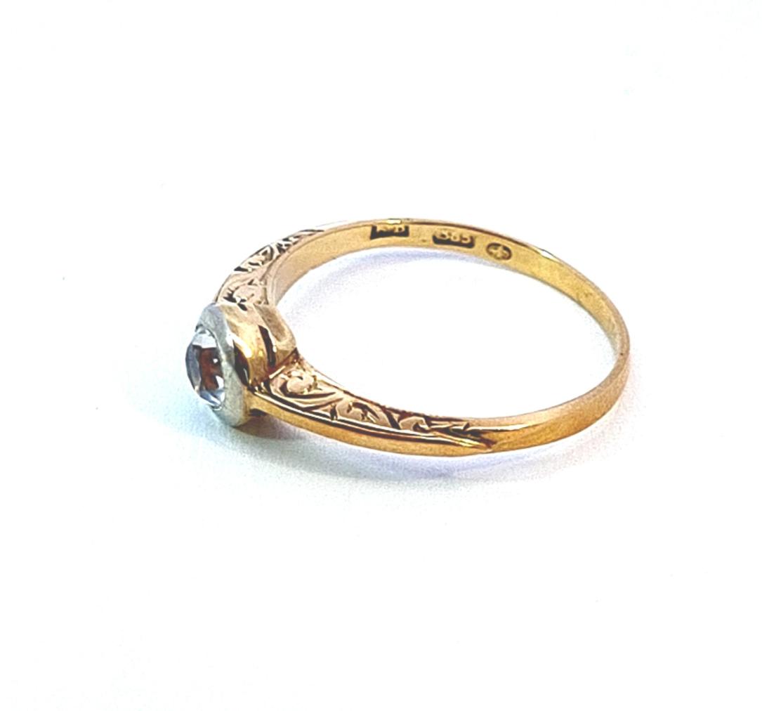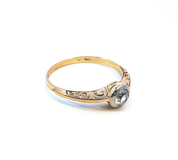 Prsten z kombinace žlutého a bílého zlata o ryzosti 585/1000, punc lvíček. Váha 1,80 g, velikost 52, v nejširším bodě 6 mm. Kámen je syntetický.