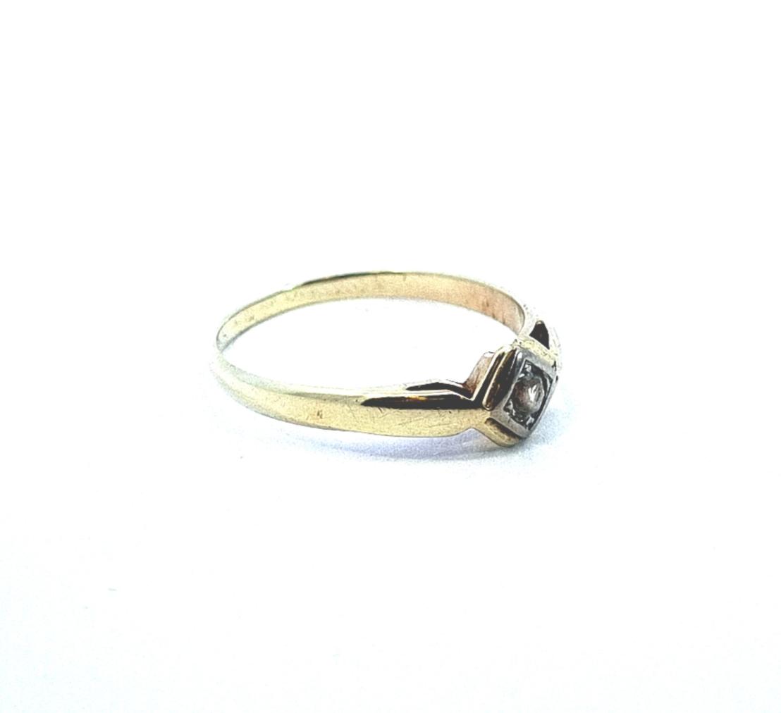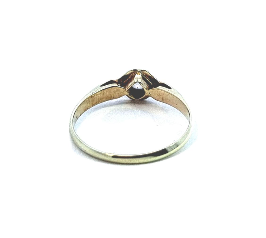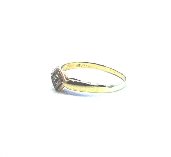Zlatý prsten o ryzosti 585/1000, punc lvíček. Velikost 63, váha 2,61 g, v nejširším bodě 7 mm.