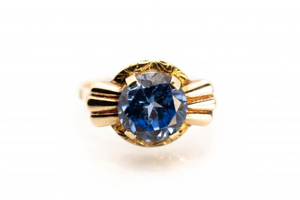 Starožitný zlatý prsten s modrým kamenem - akvamarín, 1.republika, vel. 57