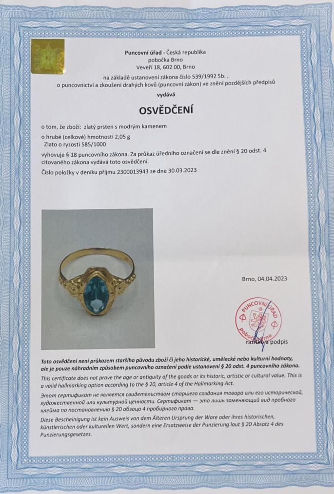 Zlatý prsten o ryzosti 585/1000, osvědčení z puncovního úřadu, váha 2,03 g, velikost 55, v nejširším bodě 13 mm, rozměry kamene - výška 10 mm, šířka 6 mm. Kámen je syntetický.