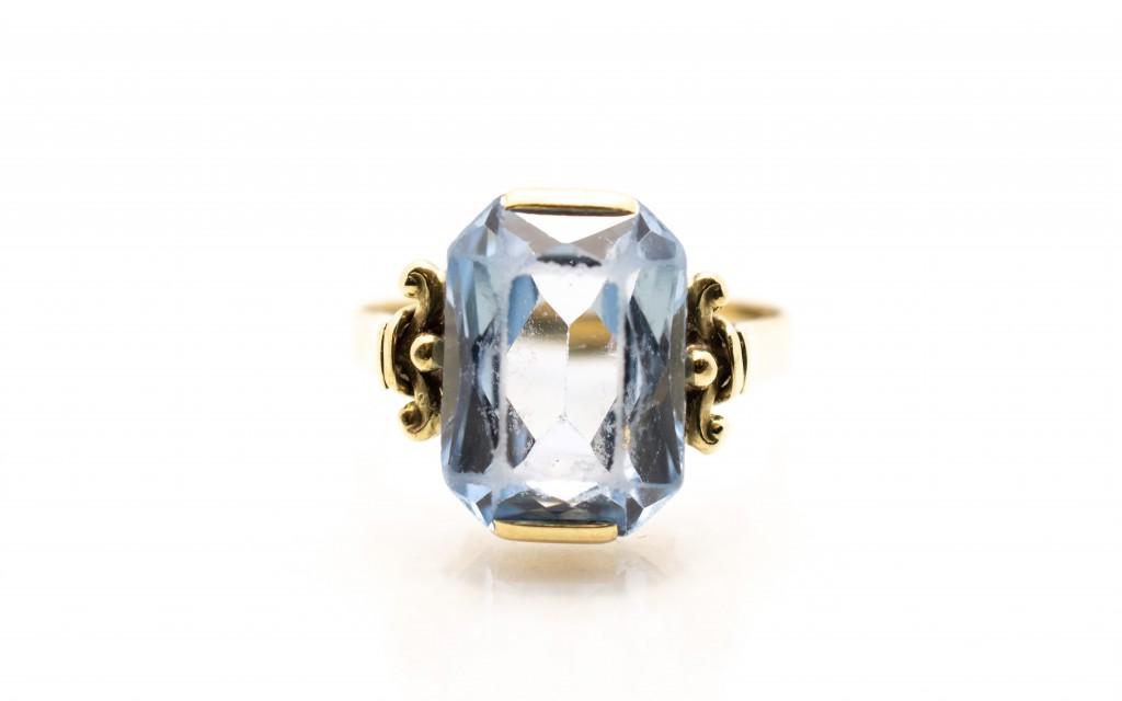 Starožitný zlatý prsten s modrým kamenem - topaz, vel. 57