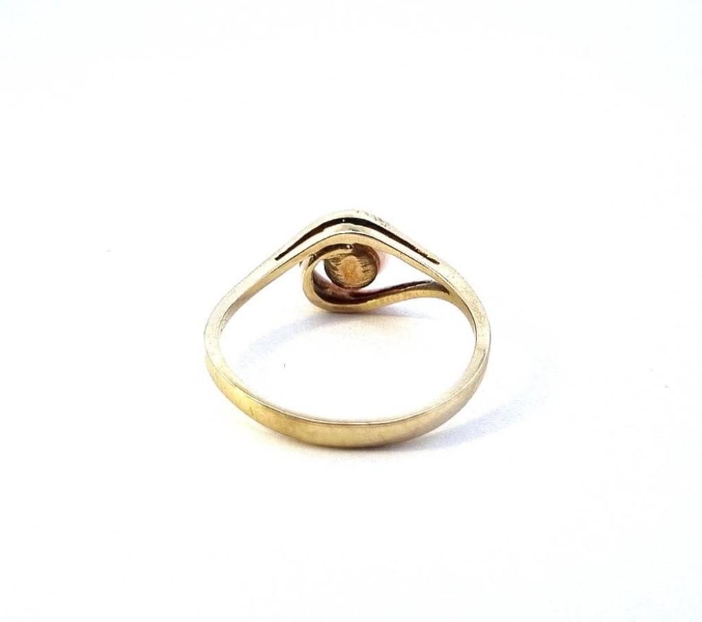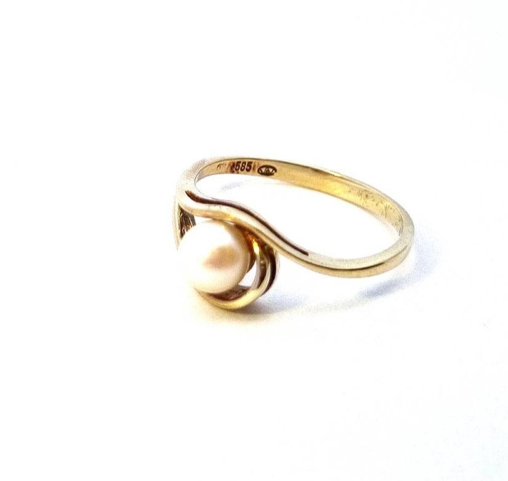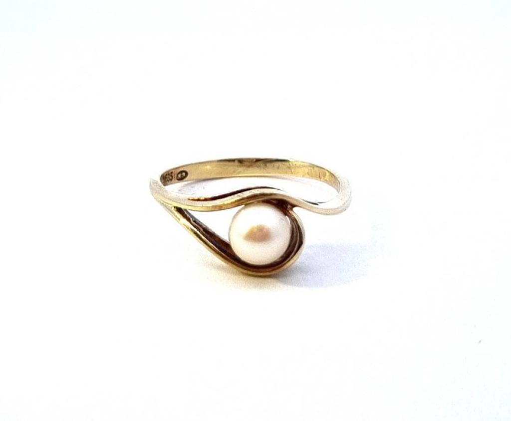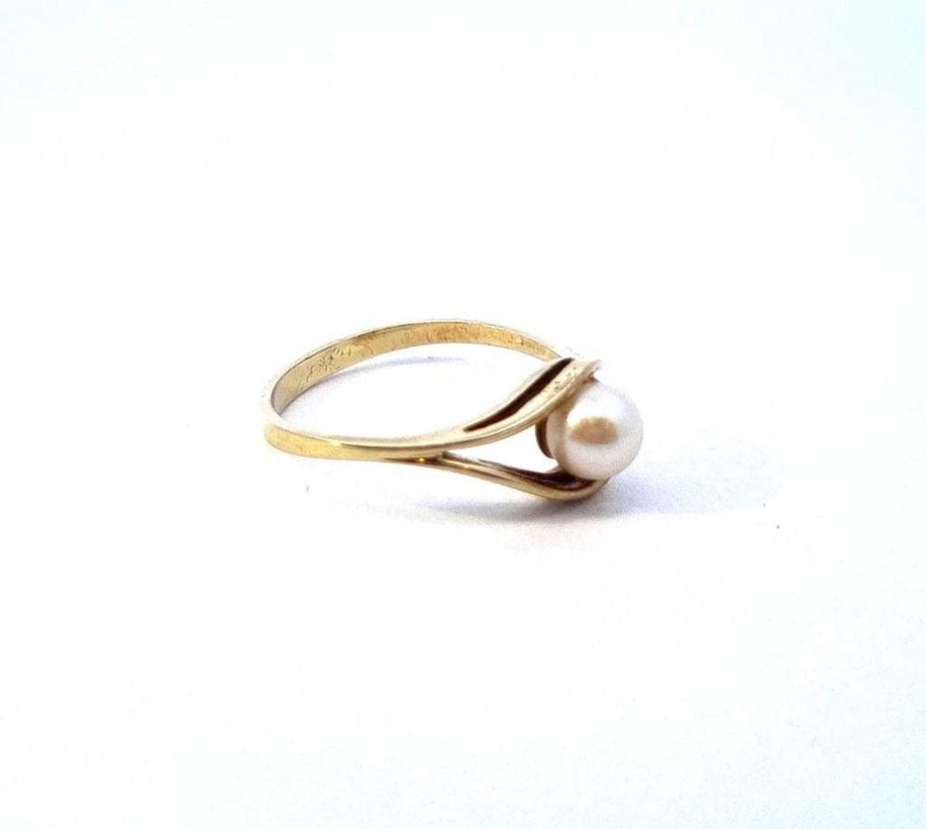 Zlatý prsten o ryzosti 585/1000, punc lyra. Velikost 57, váha 2,48 g, v nejširším bodě 8 mm, průměr perly 6 mm.