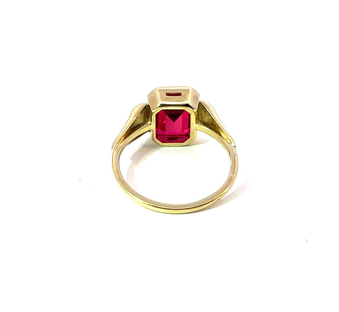 Starožitný zlatý prsten o ryzosti 585/1000, punc lyra. Velikost 52, váha 2,59 g, rozměr hlavy prstenu 10 x 13 mm. Kámen je syntetický.