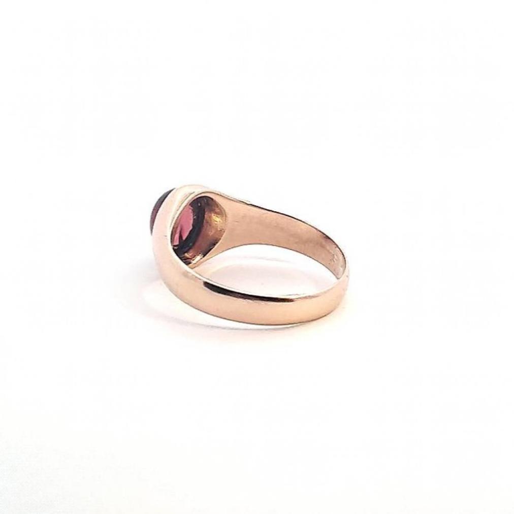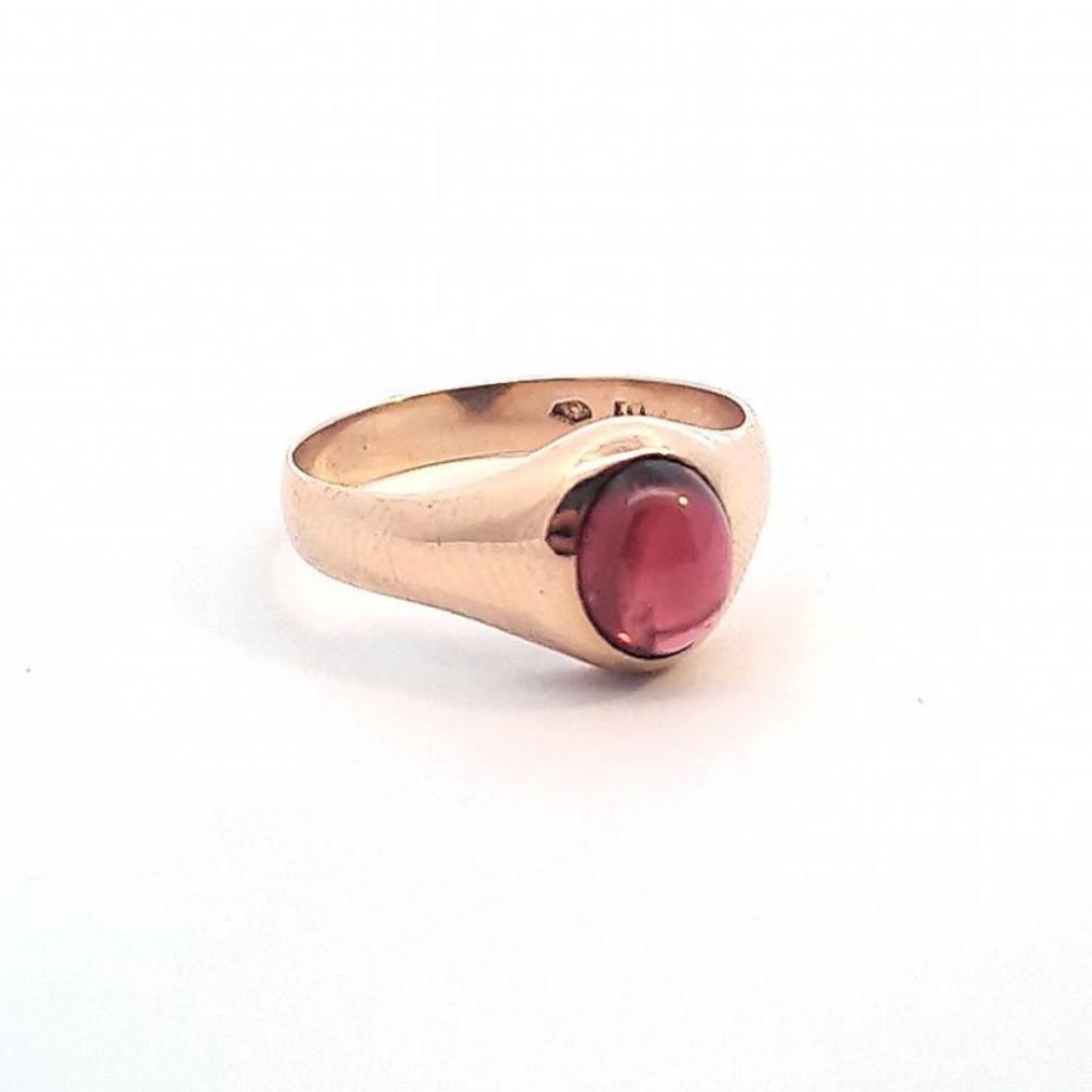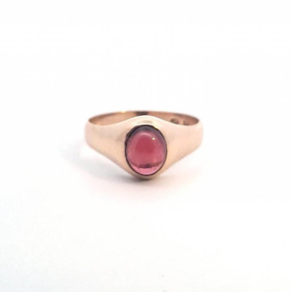 Prsten z růžového zlata o ryzosti 580/1000, punc liška. Velikost 54, váha 3,34 g, v nejširším bodě 9,5 mm. Kámen je oťukaný na 3 místech. Lze vidět pod lupou.