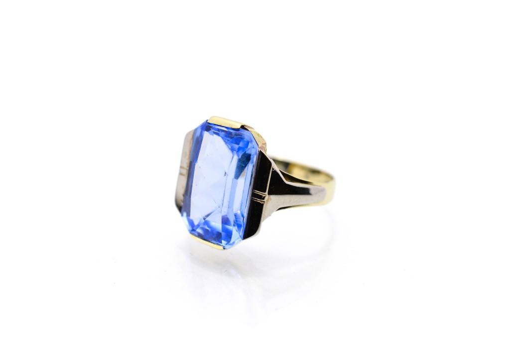 Starožitný zlatý prsten s topazem, vel. 52. Ryzost 585/1000, punc lvíček. Váha 3,52 g, rozměry kamene 14 x 9 mm. Topaz je syntetický.