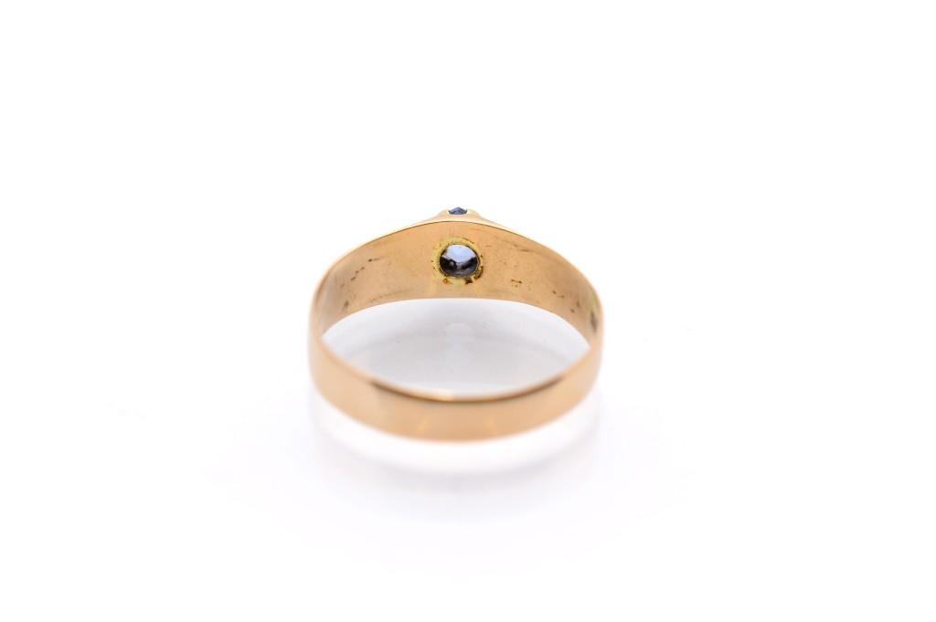 Starožitný zlatý prsten Rakousko Uhersko s topazem, vel. 59, ryzost 585/1000, punc liška, váha 2,64 g, v nejširším bodě 7mm, kámen je syntetický.