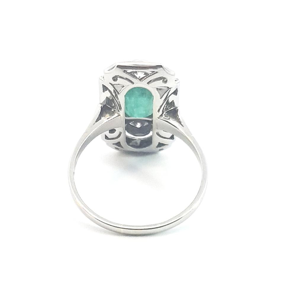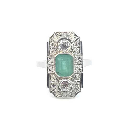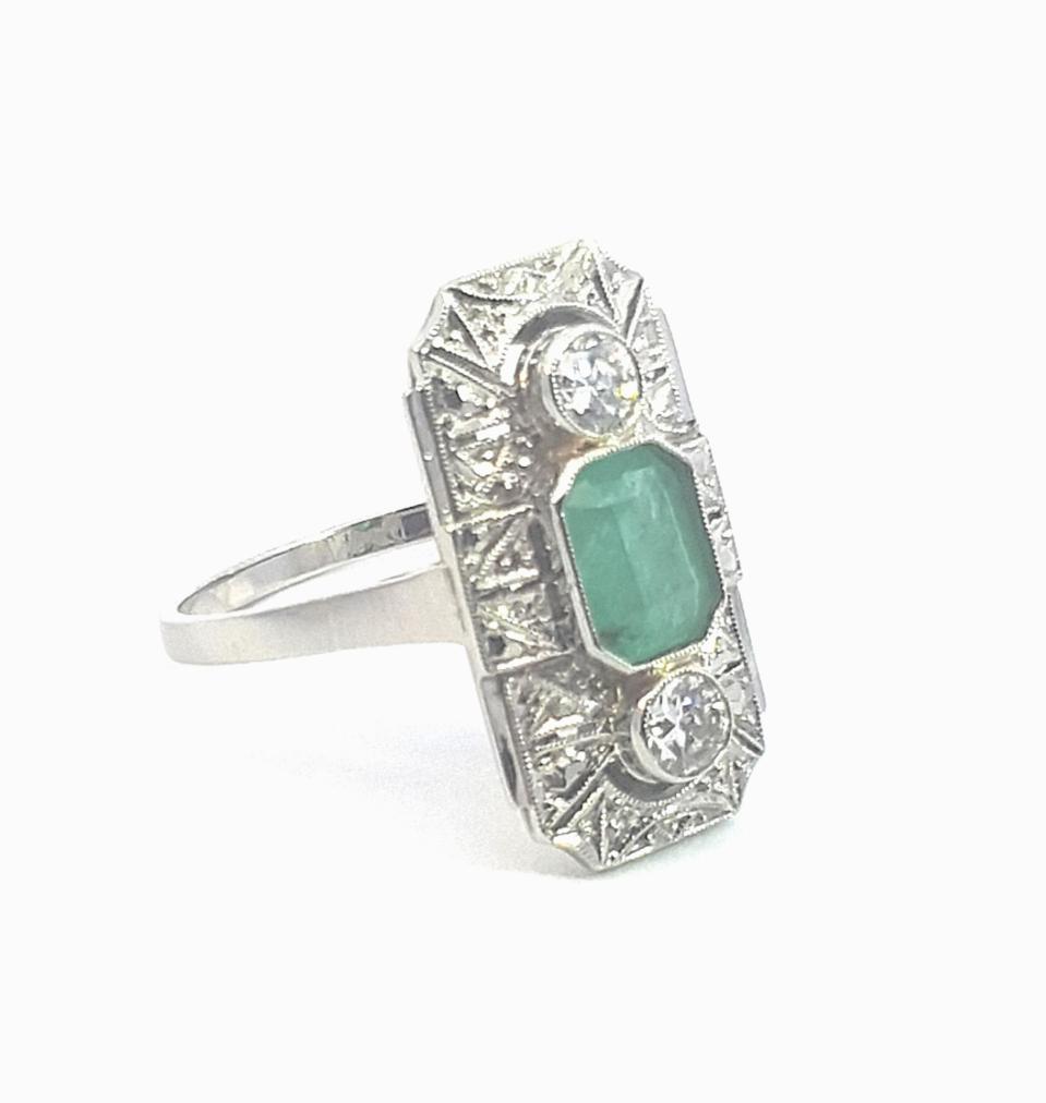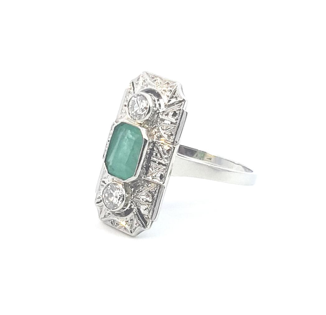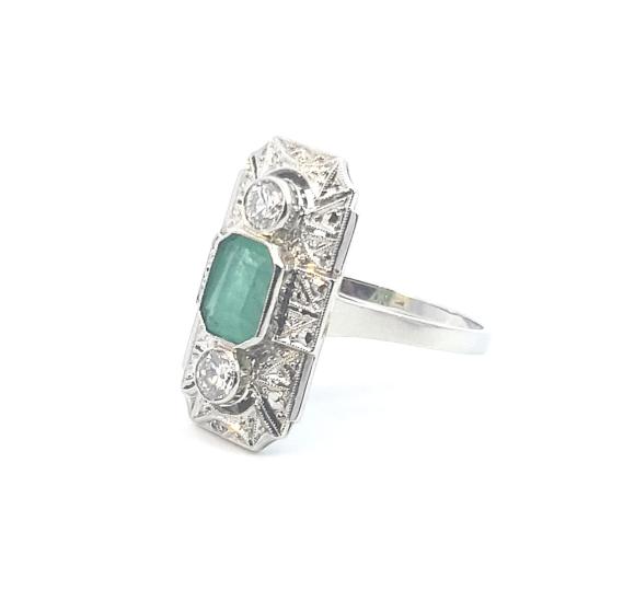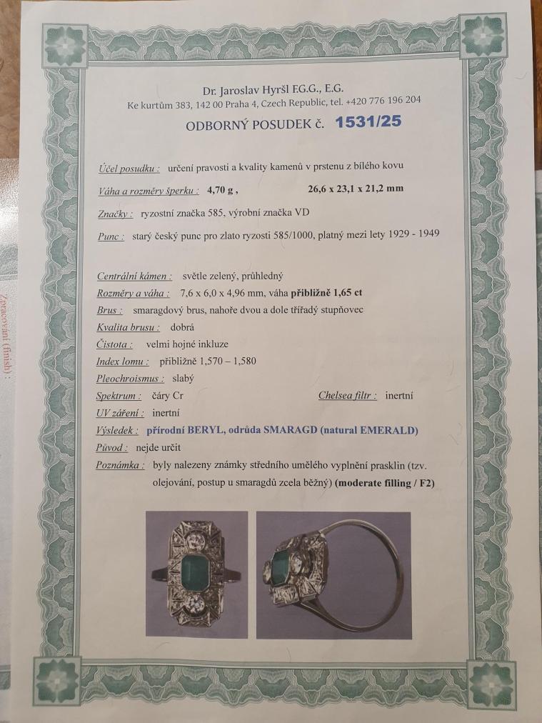 Prsten z bílého zlata o ryzosti 585/1000, punc lvíček. Velikost 60, váha 4,7 g, rozměr hlavy prstenu 23 x 13 mm. Kámen - přírodní smaragd - 1 ks, 1,65 ct. Kámen - přírodní diamant staroevropského brusu - 2 ks, dohromady cca 0,42 ct.