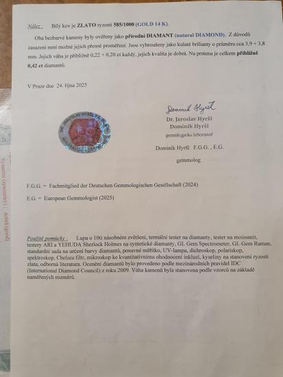 přírodní smaragd - 1 ks, přírodní diamant staroevropského brusu - 2 ks, celkem cca 0,42 ct