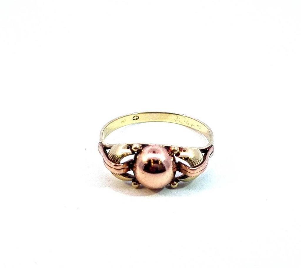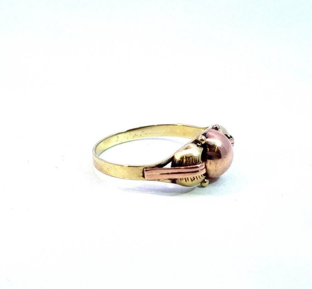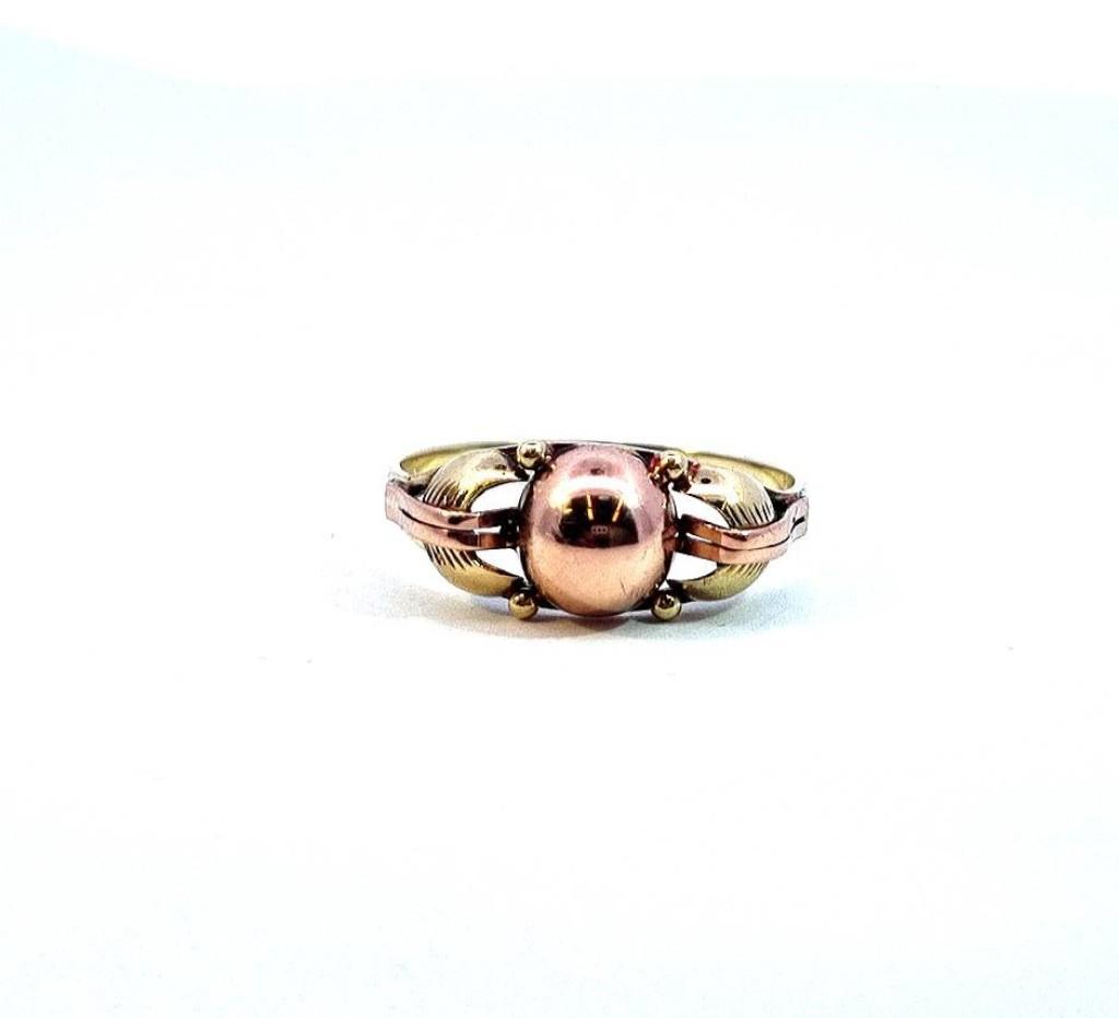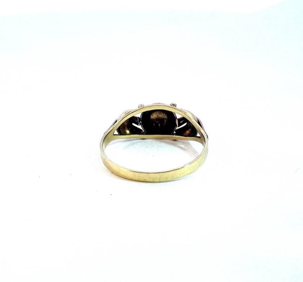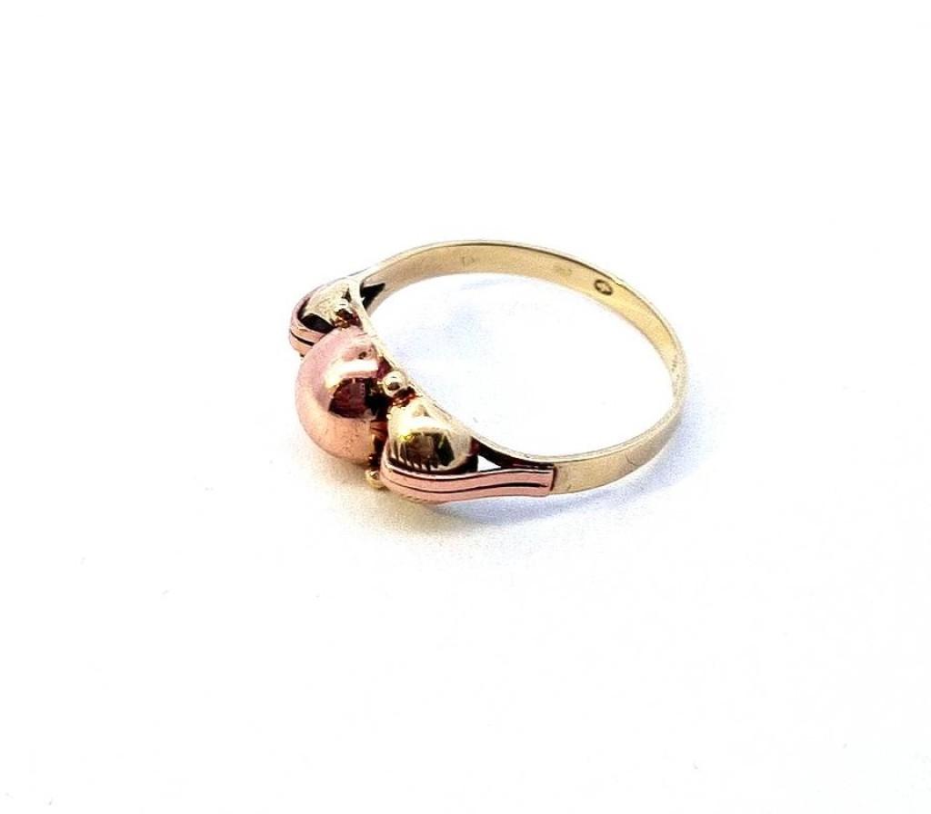 Zlatý prsten o ryzosti 585/1000, punc lvíček. Velikost 57, váha 1,85 g, šířka v nejširším bodě 8 mm.