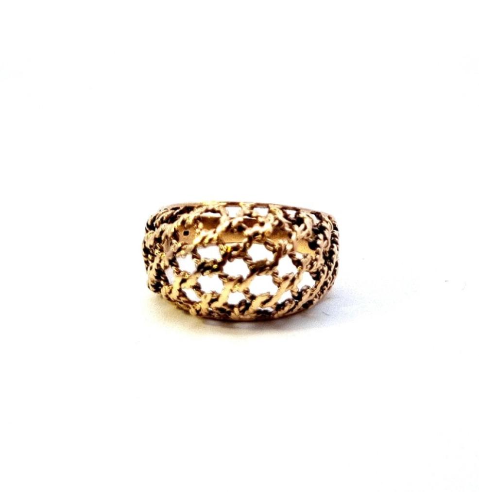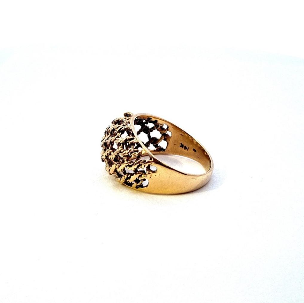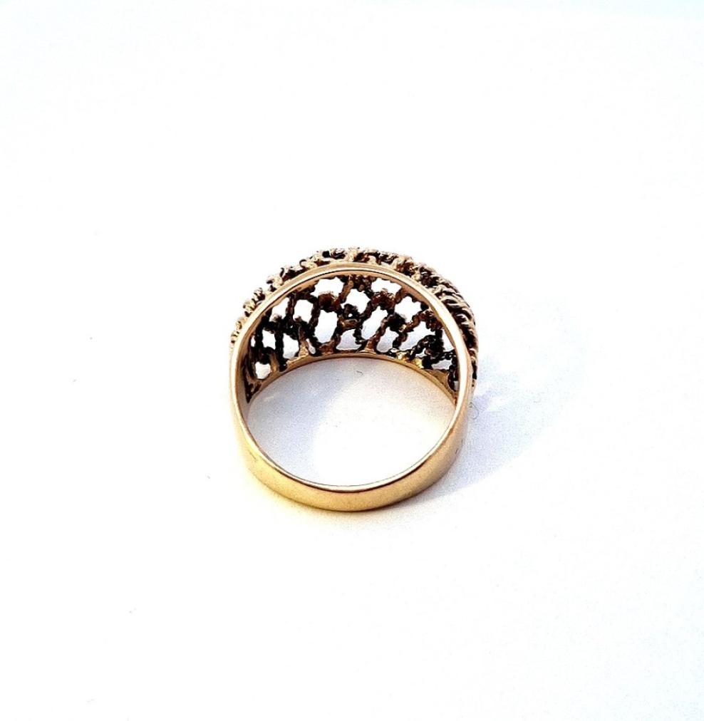 Zlatý prsten o ryzosti 585/1000, punc lyra. Velikost 59, váha 5,75 g, šířka v nejširším bodě 13 mm.