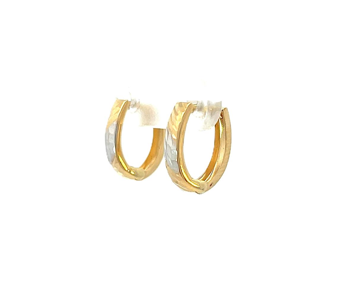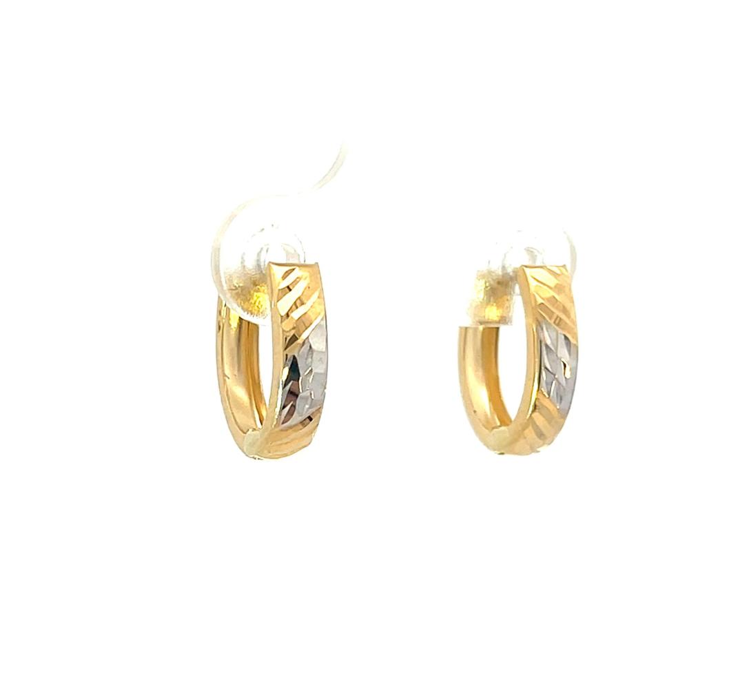 Náušnice z kombinace žlutého a bílého zlata o ryzosti 585/1000, punc labuť. Váha 0,97 g, výška 12 mm, v nejširším bodě 3,5 mm.