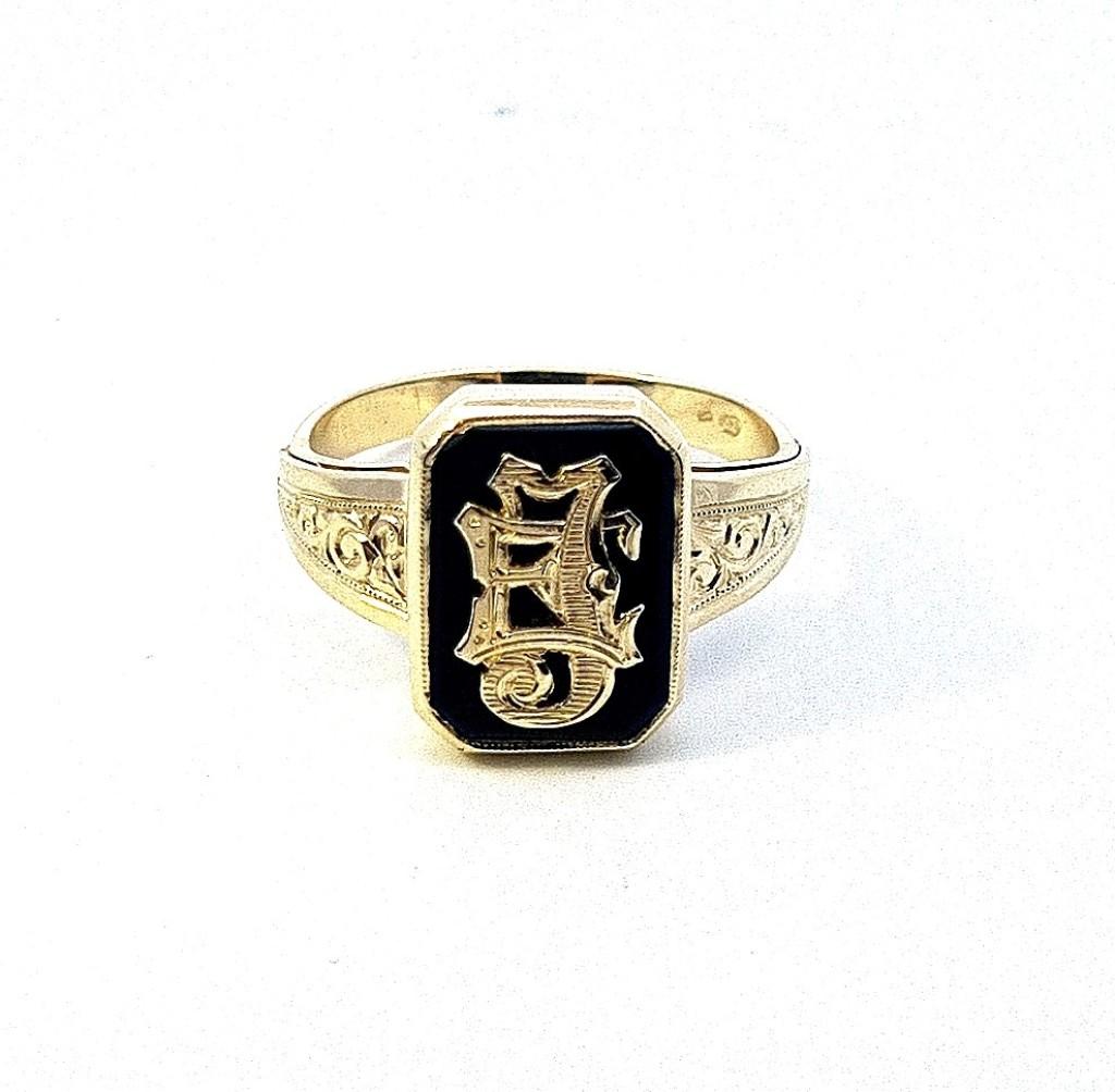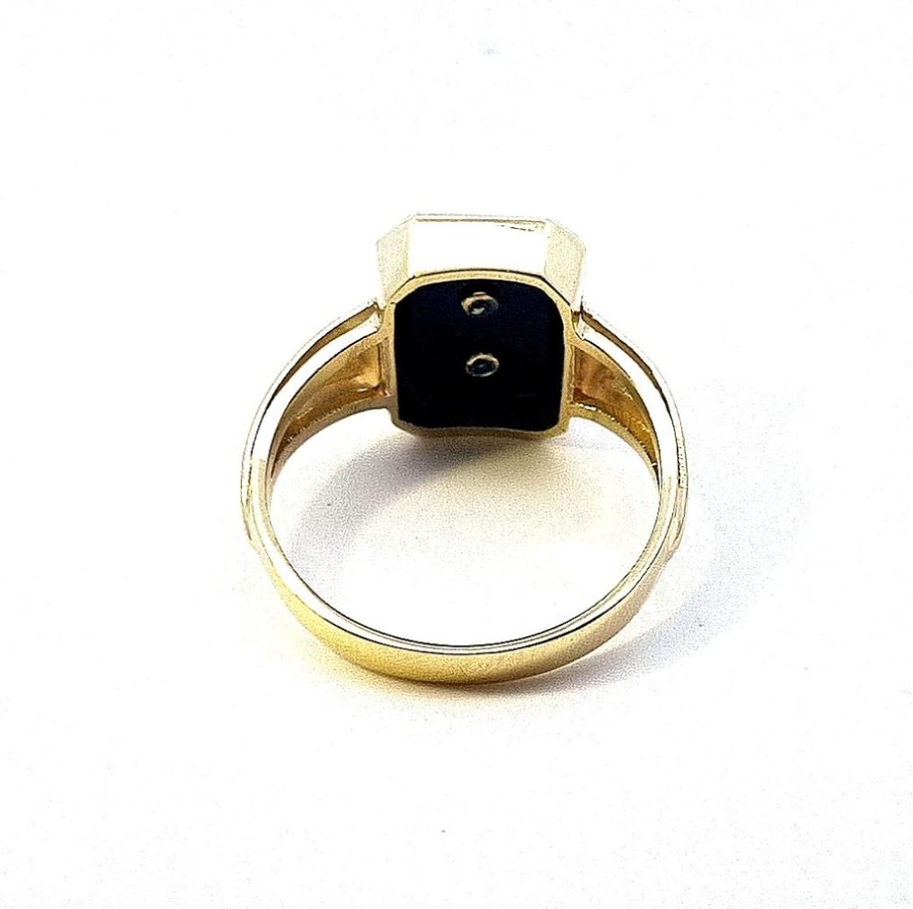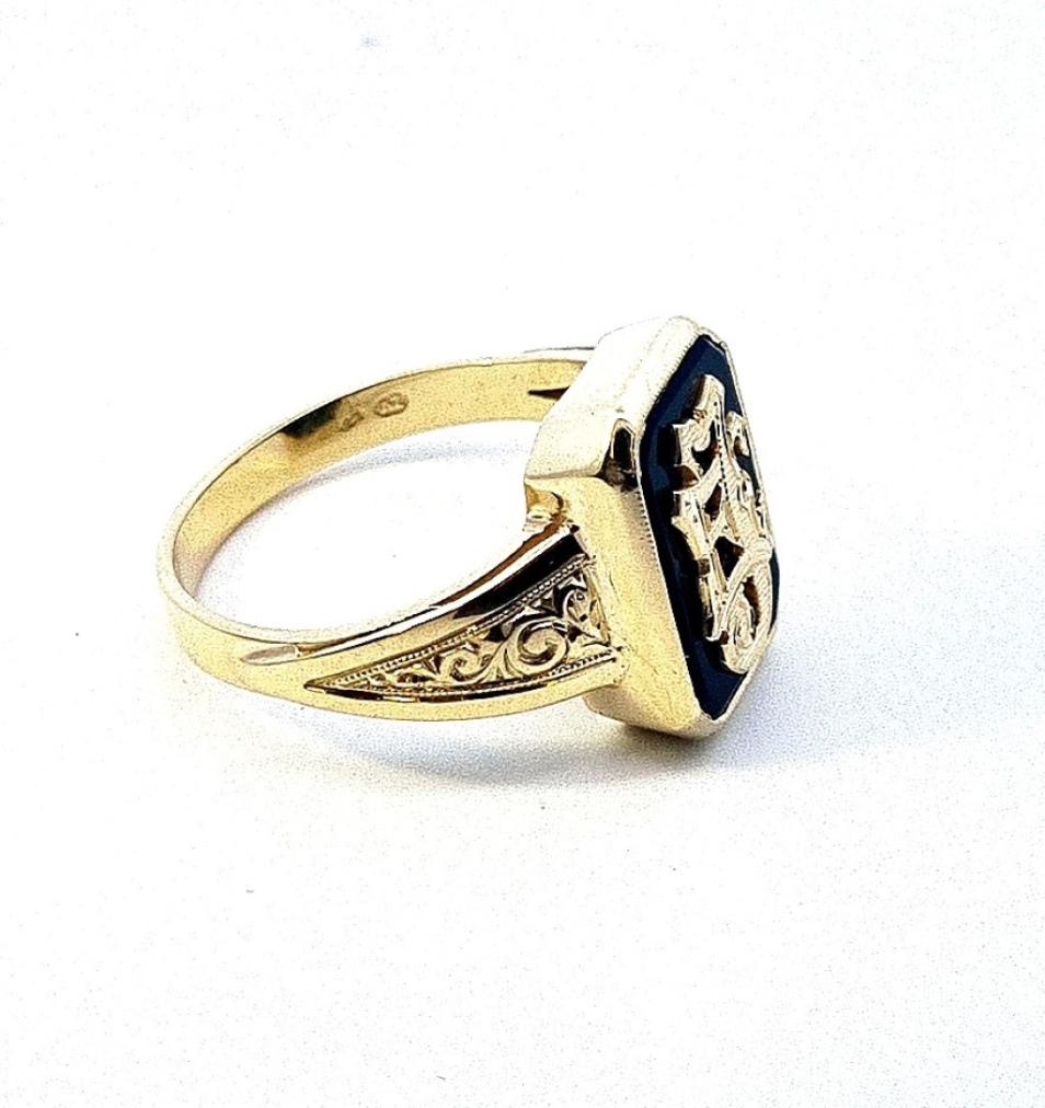 Zlatý pánský prsten s onyxem a monogramem, vel. 62