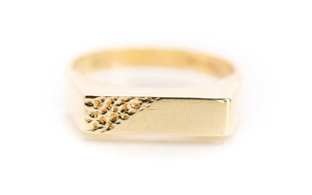Zlatý prsten o ryzosti 585/1000, punc labuť, váha 6,07 g, velikost 64, v nejširším bodě 5 mm.