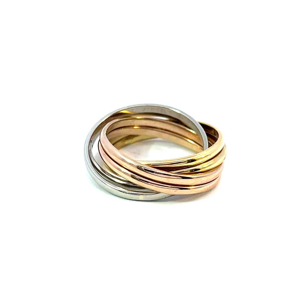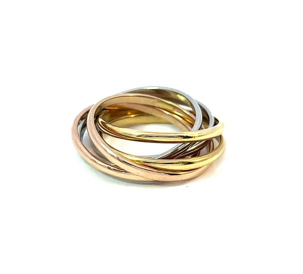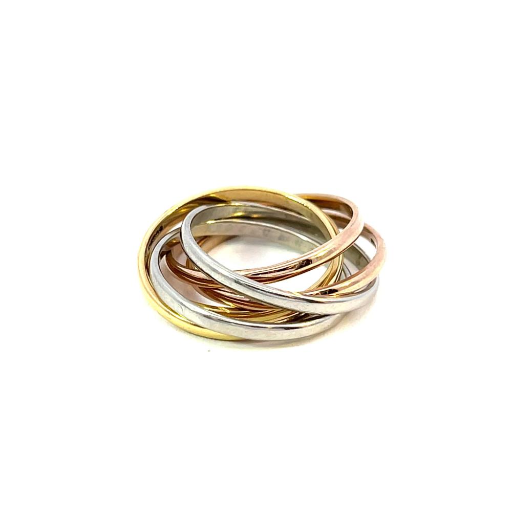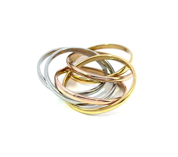 Prsten složený z 6 kroužků o ryzosti 750/1000, platný punc pro Spojené království. Velikost cca 53 (přesné proměření vzhledem k charakteru šperku je obtížné), váha 10,73 g, šířka jednoho kroužku 2 mm, v nejširším bodě 12 mm.