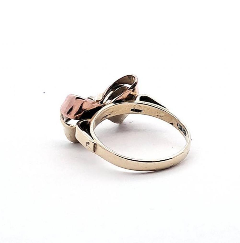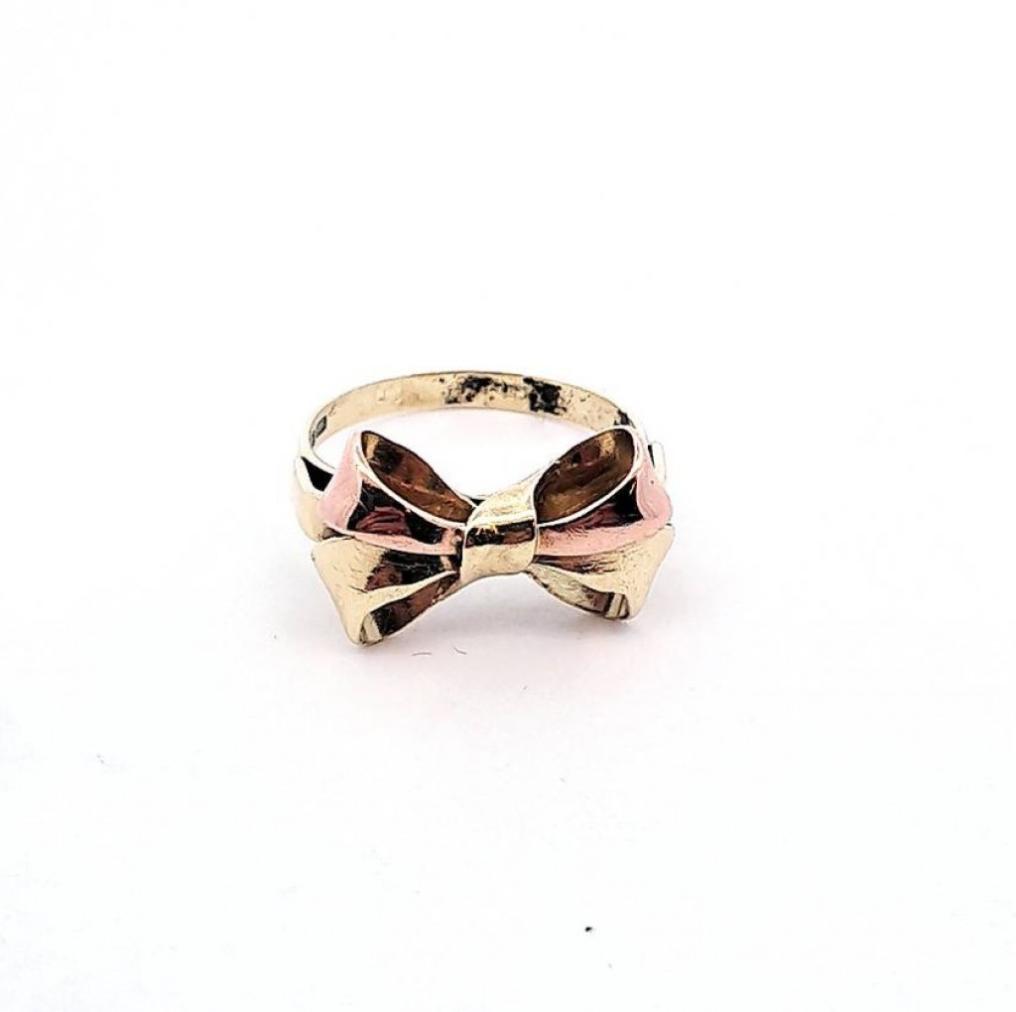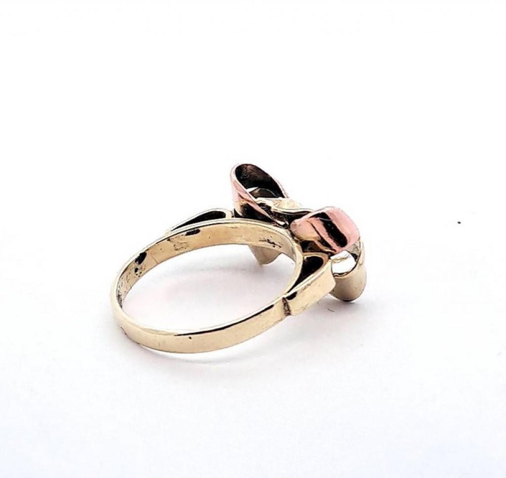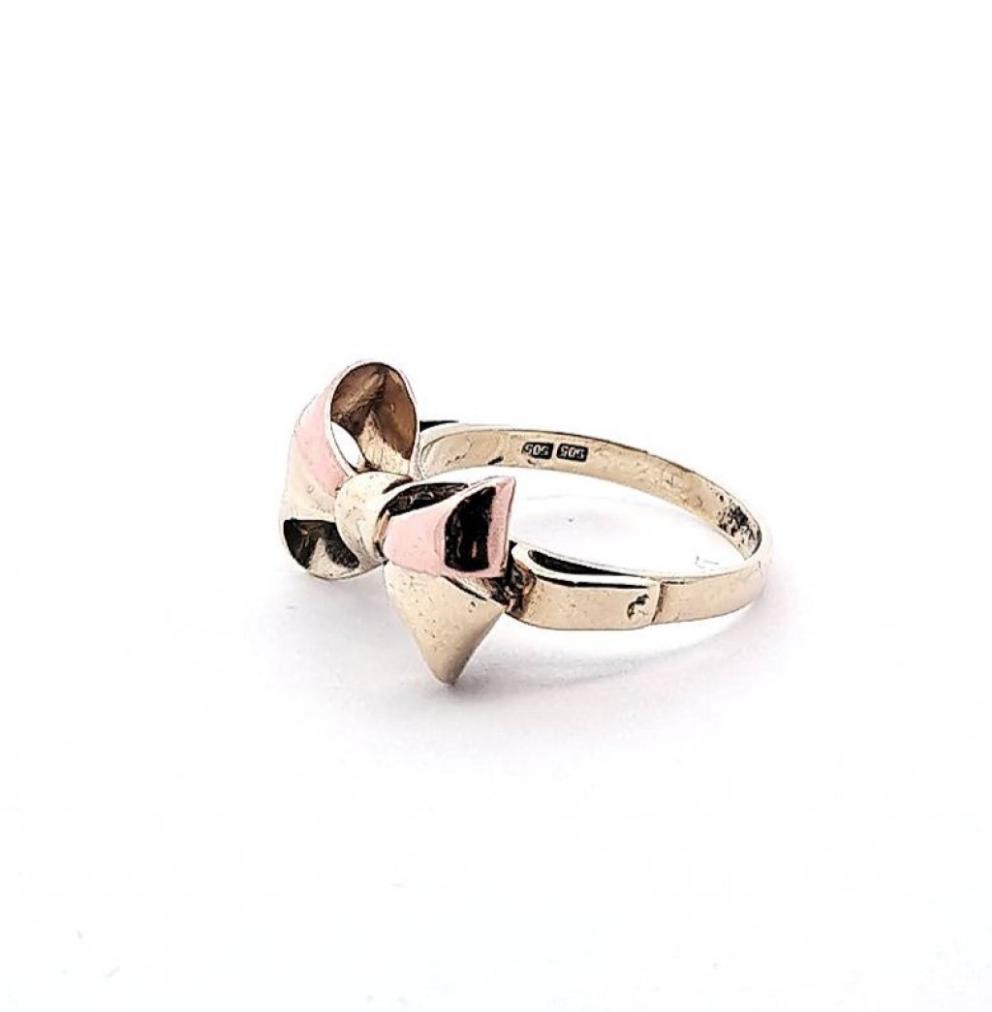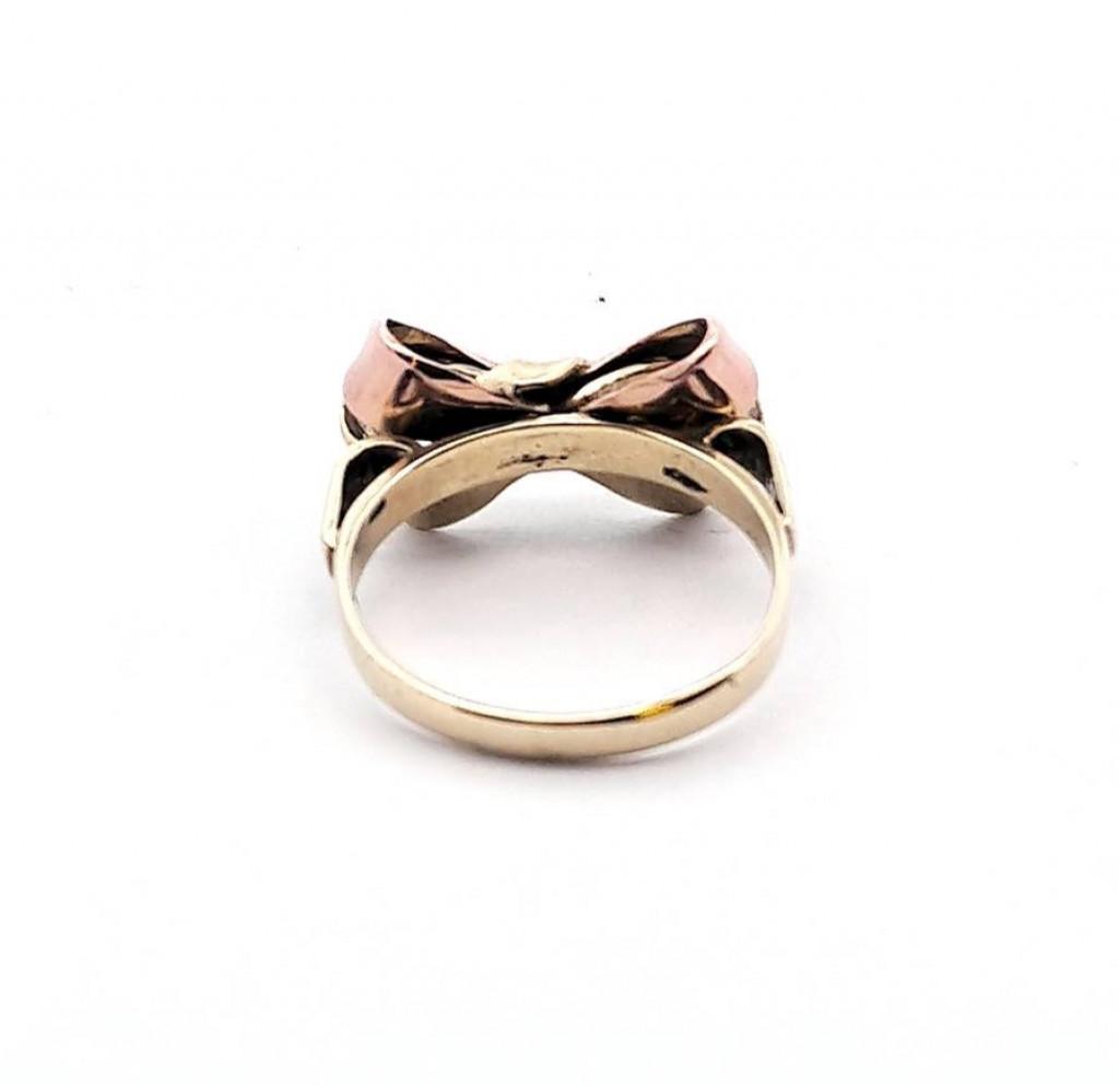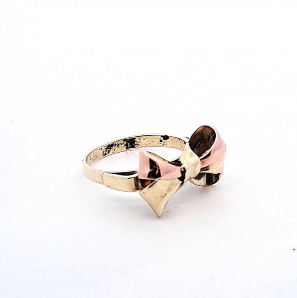 Zlatý prsten ve tvaru mašličky z kombinace žlutého a růžového zlata. Zlato o ryzosti 585/1000, punc labuť. Velikost prstenu je 56, váha 4,32 g. Rozměry mašle jsou 19 x 11 mm.
