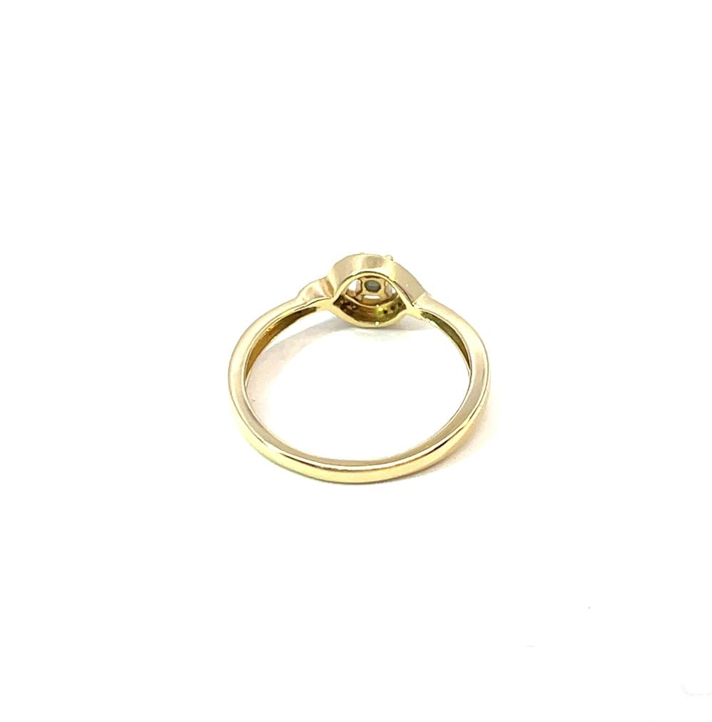 Zlatý prsten o ryzosti 585/1000, punc labuť. Váha 2,19 g, velikost 54, v nejširším bodě 7 mm. Kámen - syntetický akvamarín - 1 ks. Kámen - přírodní diamant briliantového brusu - 18 ks, dohromady cca 0,07 ct.