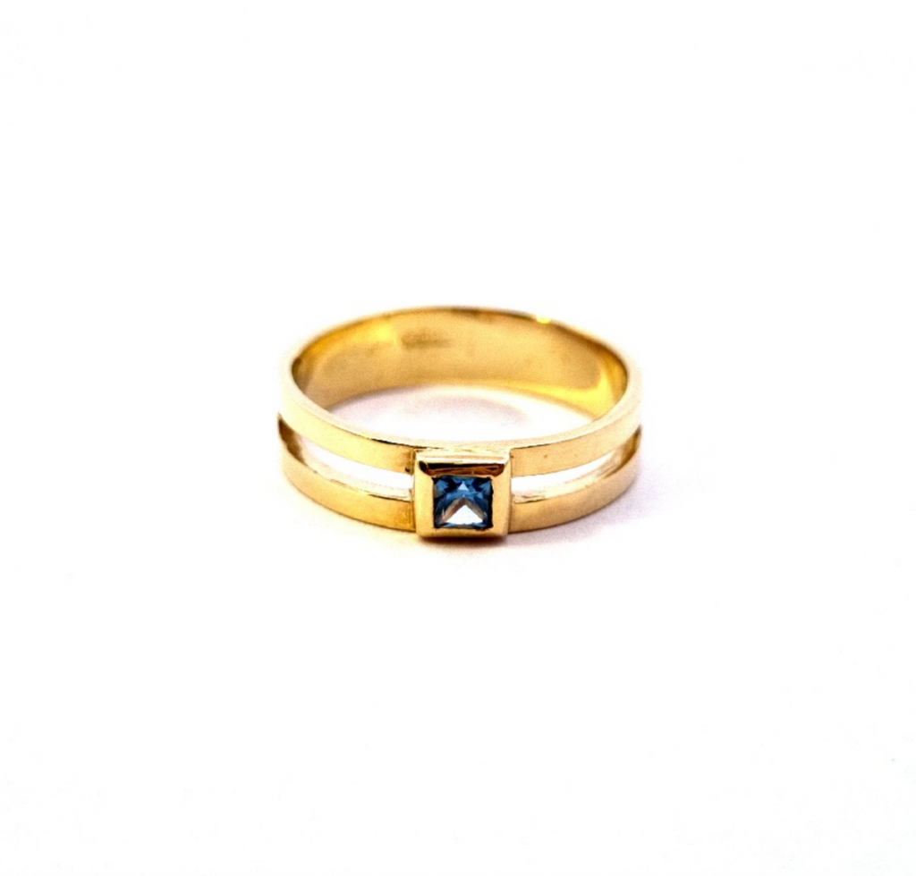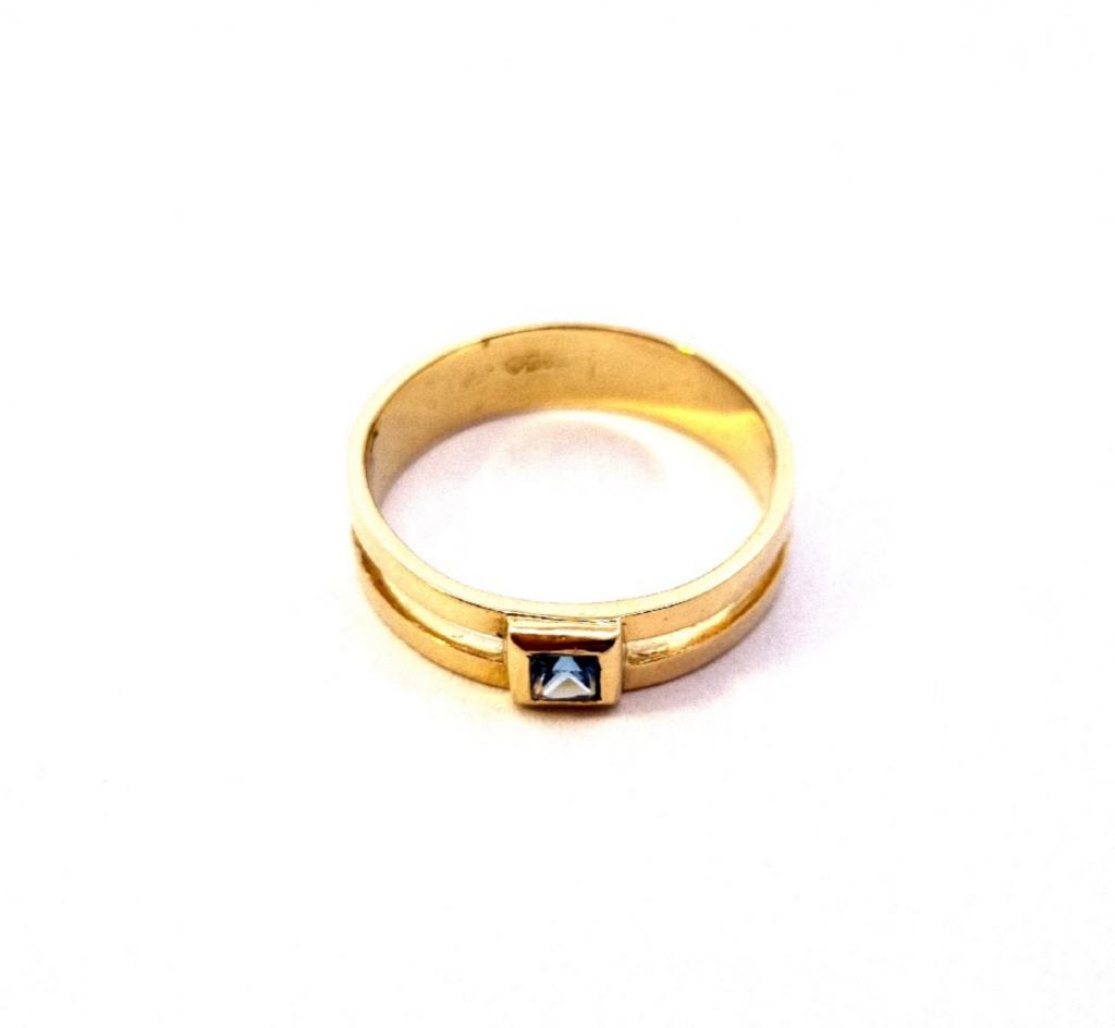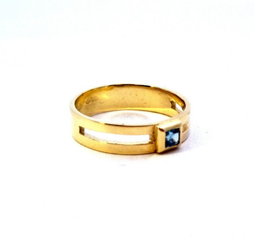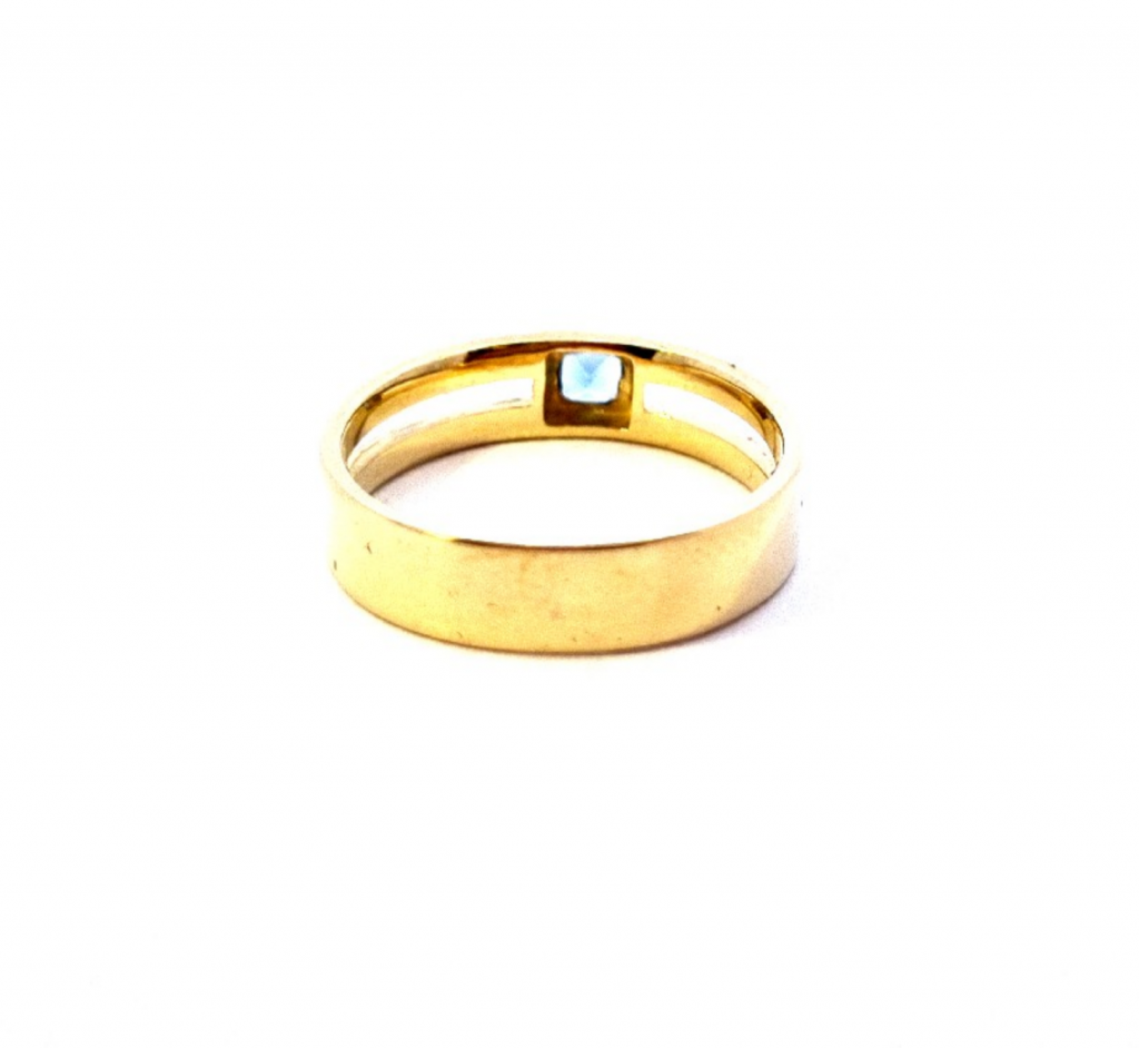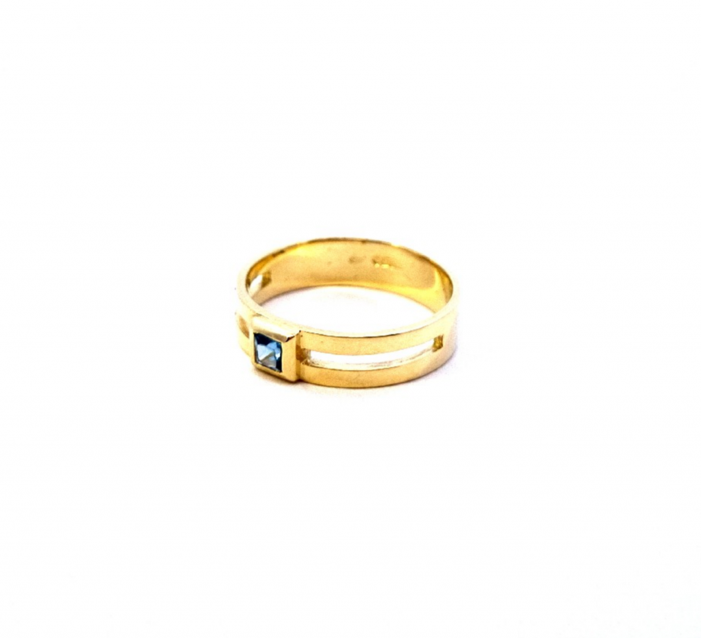 Zlatý prsten o ryzosti 585/1000, punc labuť. Velikost 56, váha 3,69 g, v nejširším bodě 5 mm. Kámen je syntetický.