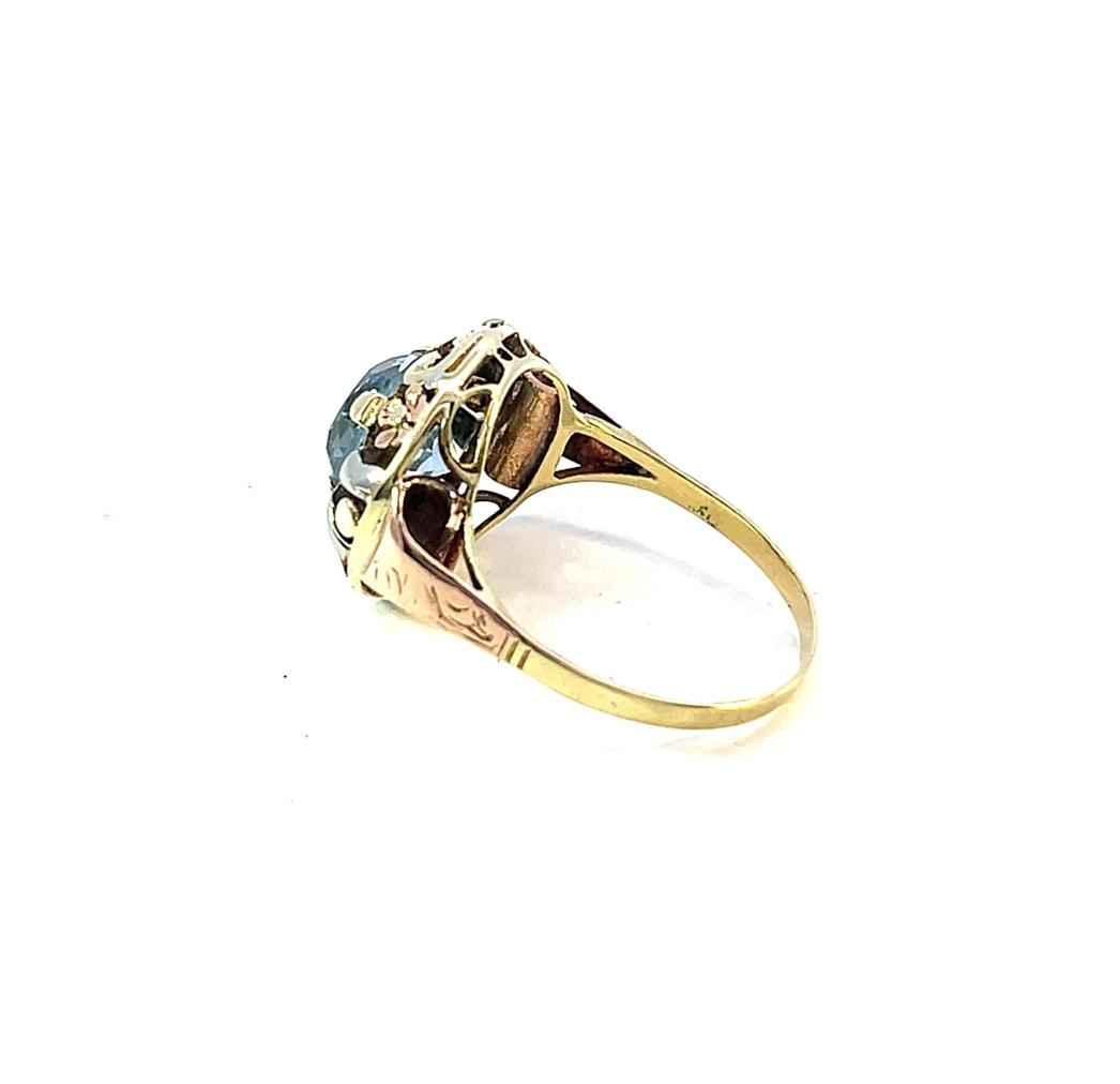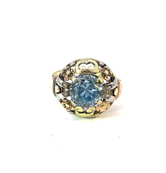 Prsten z kombinace žlutého, bílého a růžového zlata o ryzosti 585/1000, punc labuť. Velikost 56, váha 3,91 g, průměr hlavy prstenu 15,5 mm, průměr kamene 9 mm. Kámen je syntetický, lehce kloktá a nese známky opotřebení.