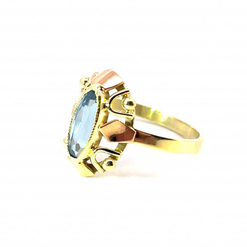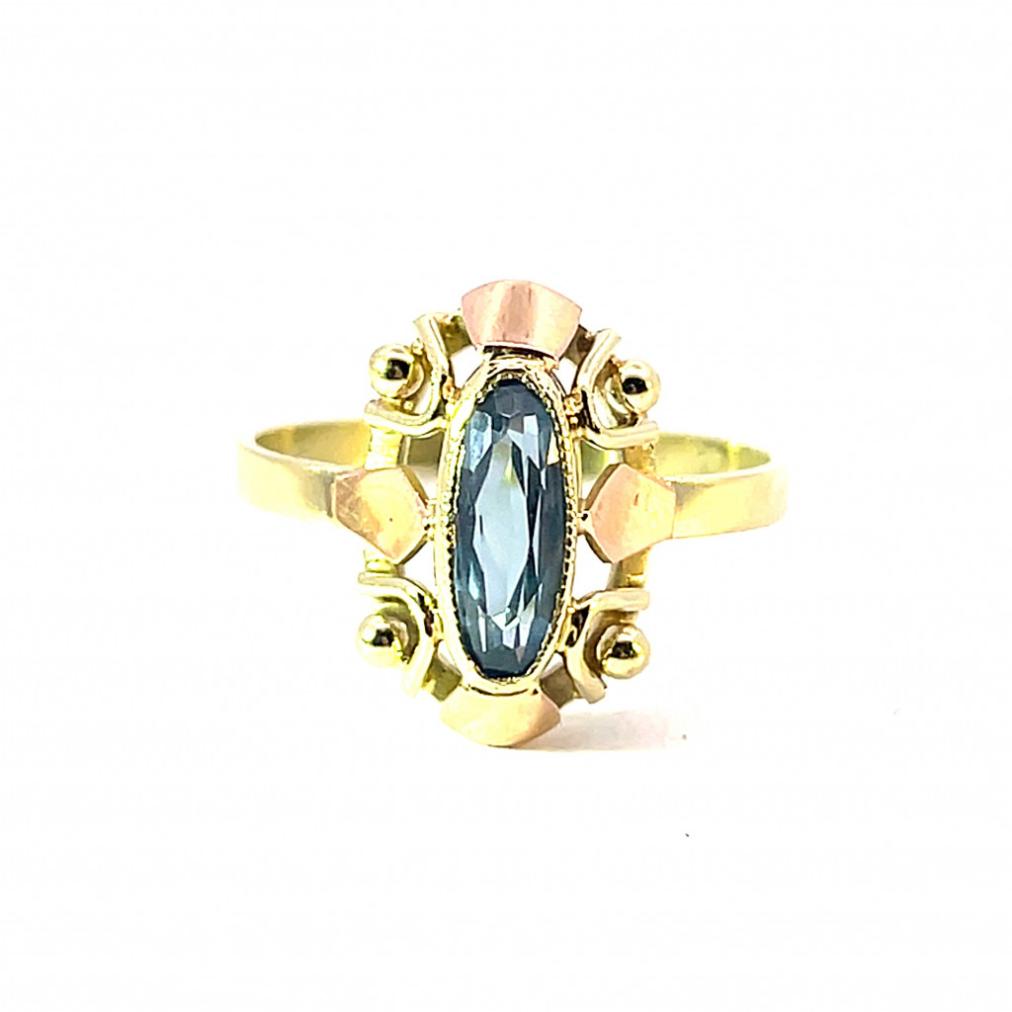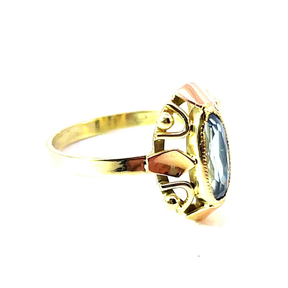 Prsten z kombinace žlutého a růžového zlata o ryzosti 585/1000, punc labuť. Velikost 57, váha 2,86 g, rozměr hlavy prstenu 15,5 x 11,5 mm, rozměr kamene 9,5 x 5 mm. Kámen je syntetický.