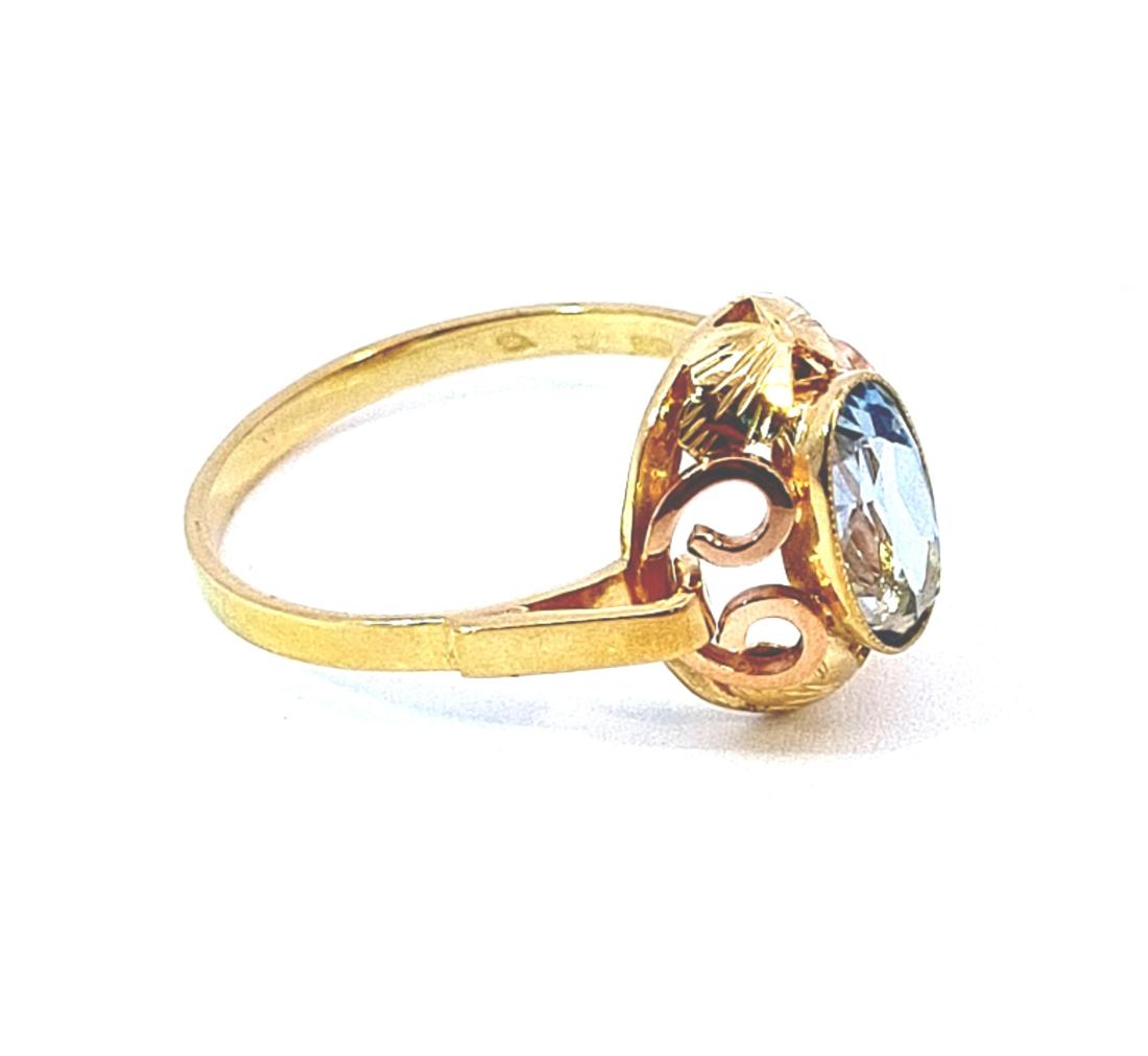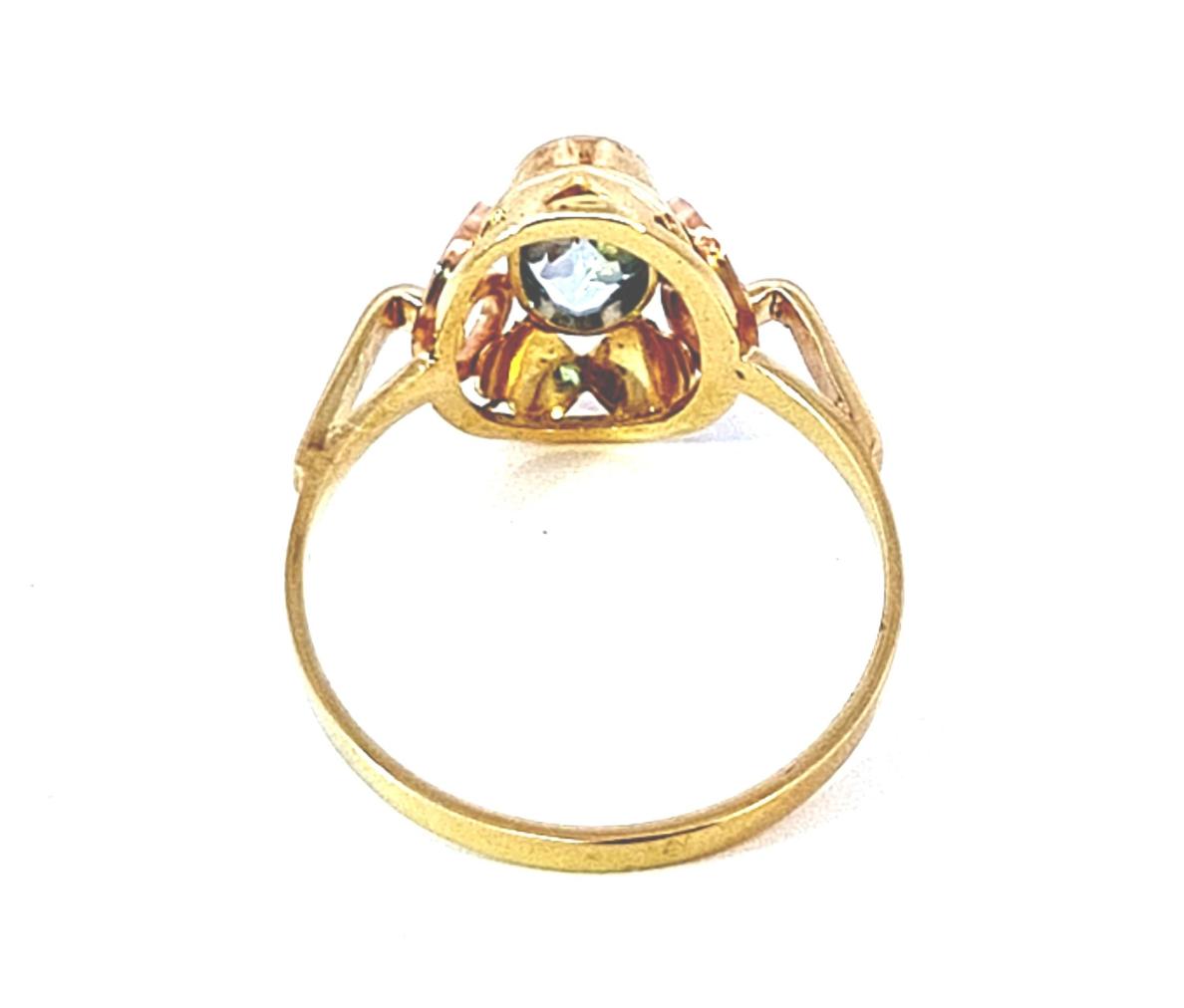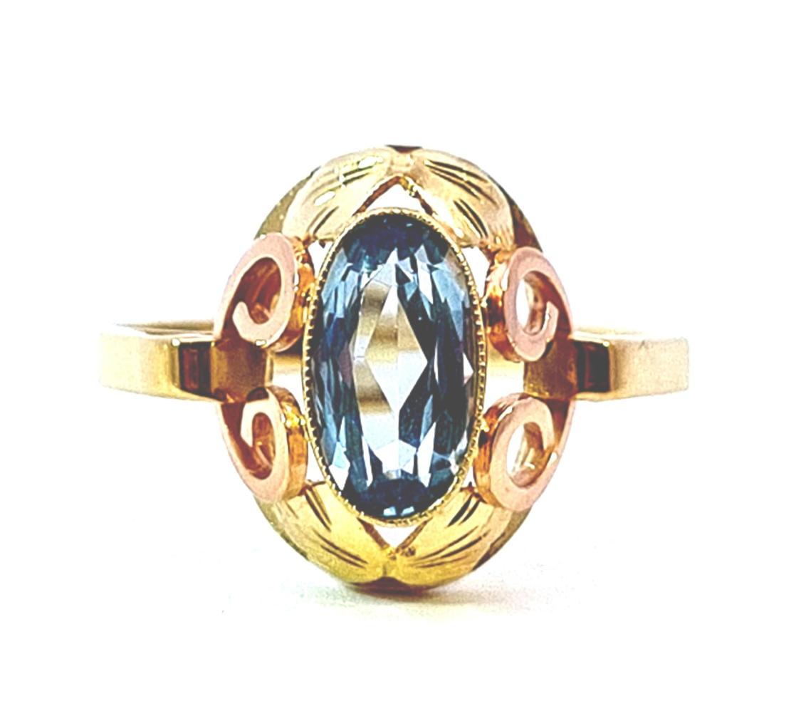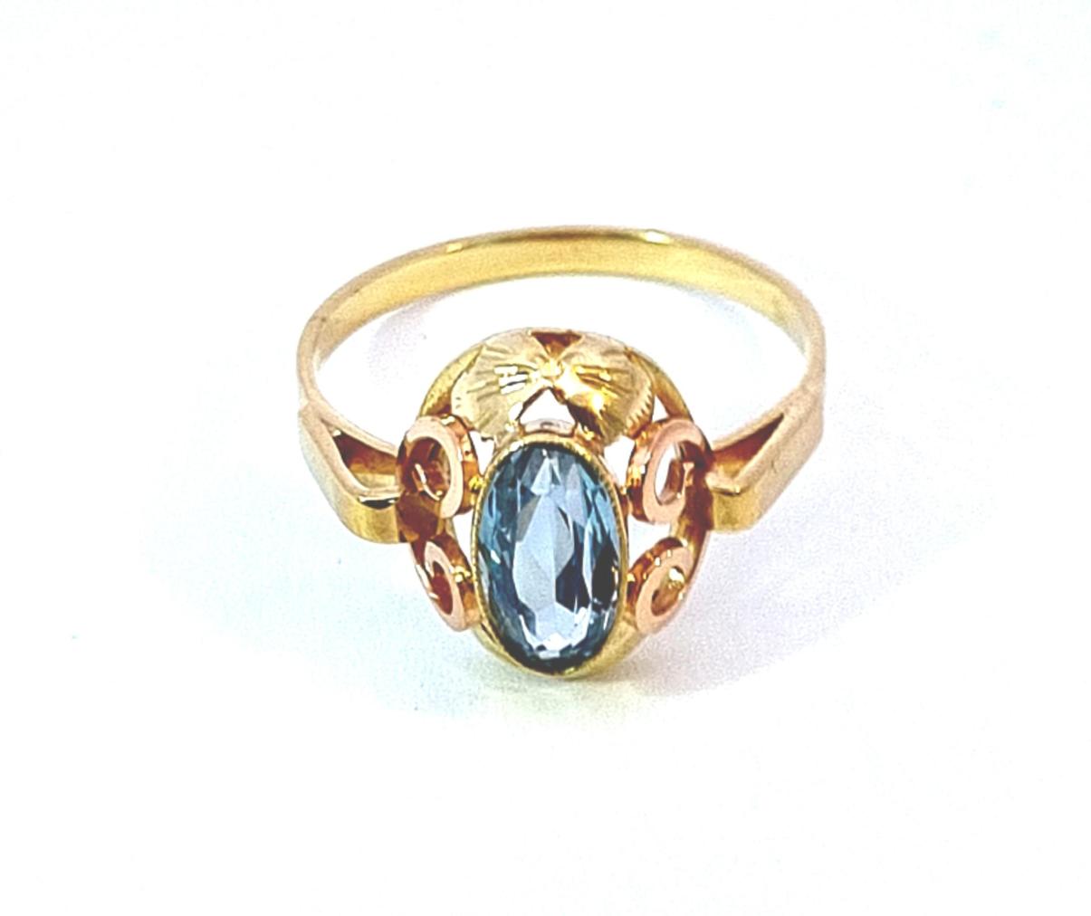 Prsten z kombinace žlutého a růžového zlata o ryzosti 585/1000, punc čejka. Váha 3,01 g, velikot 59, rozměr hlavy prstenu 14 x 11 mm. Kámen je syntetický a velmi lehce kloktá.