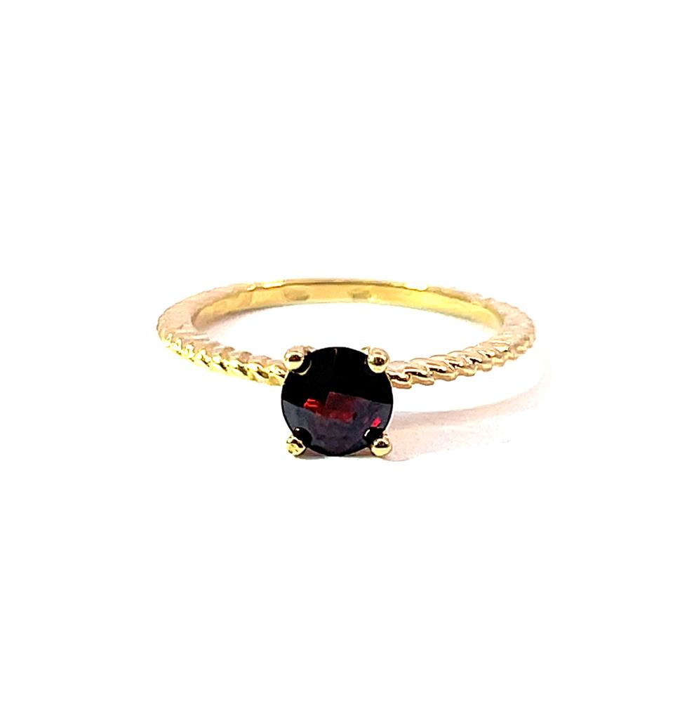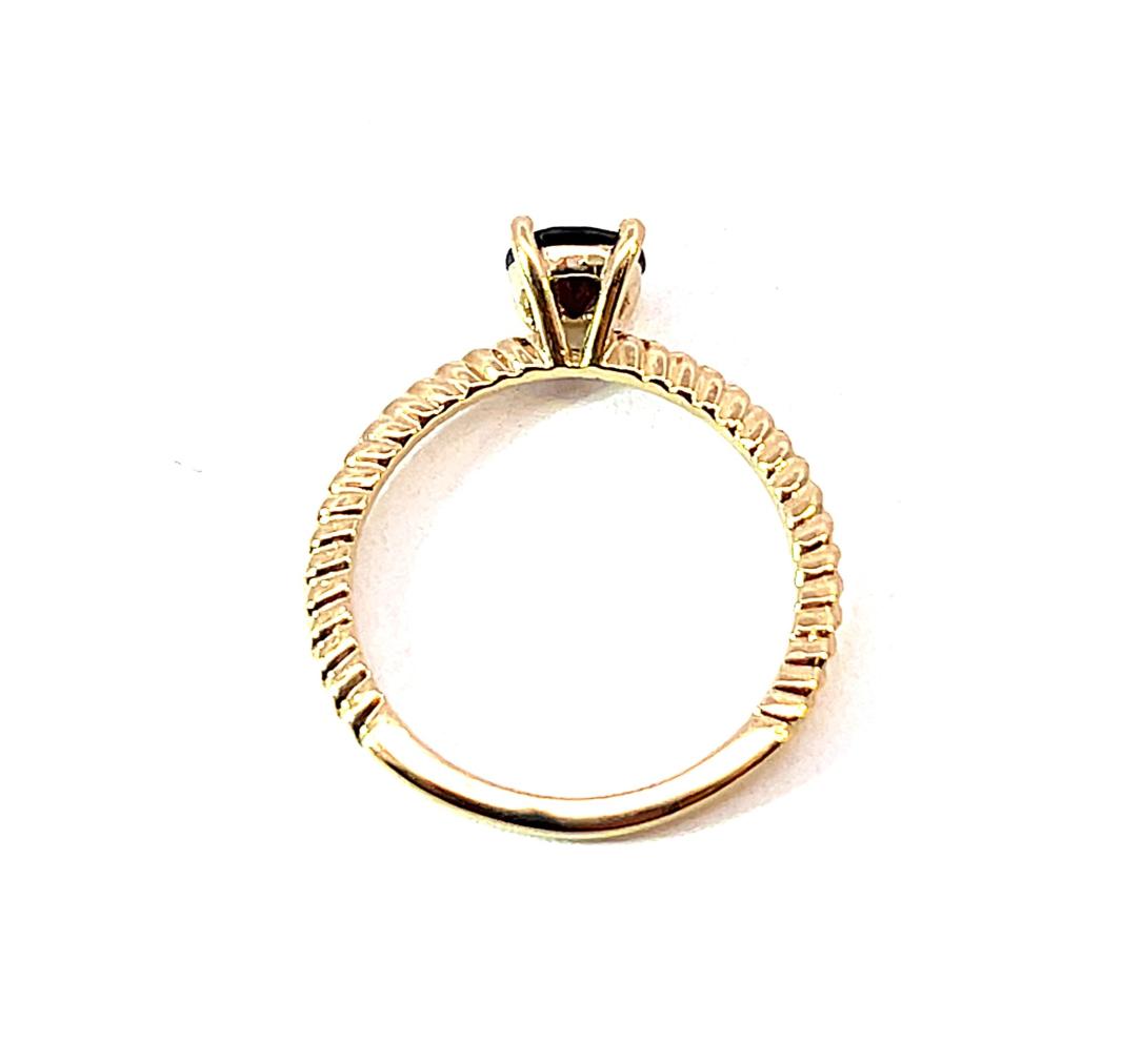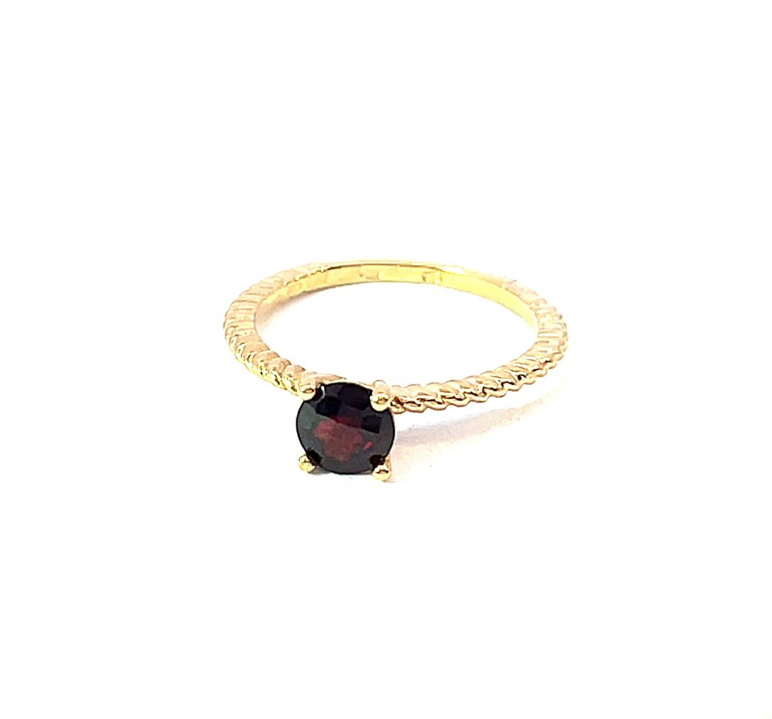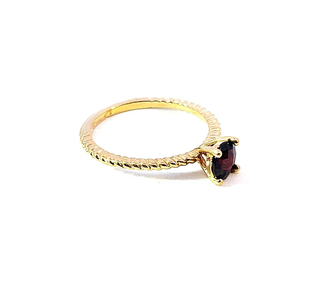 Jemný zlatý prsten s tmavě červeným kamenem. Ryzost 585/1000 s puncem labuť. Velikost 48, váha 1,49 g. Průměr kamene je 5 mm.