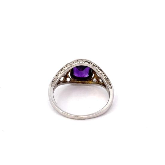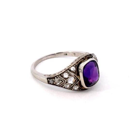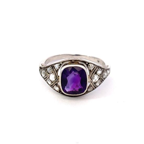 Prsten z bílého zlata o ryzosti 585/1000, punc labuť. Velikost 53, váha 2,78 g, v nejširším bodě 10,5 mm. Kámen - přírodní ametyst - 1 ks. Kámen - přírodní diamant routa - 14 ks.