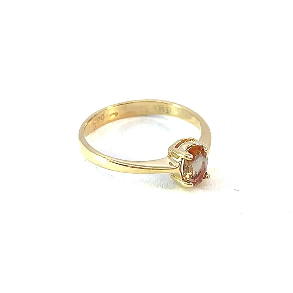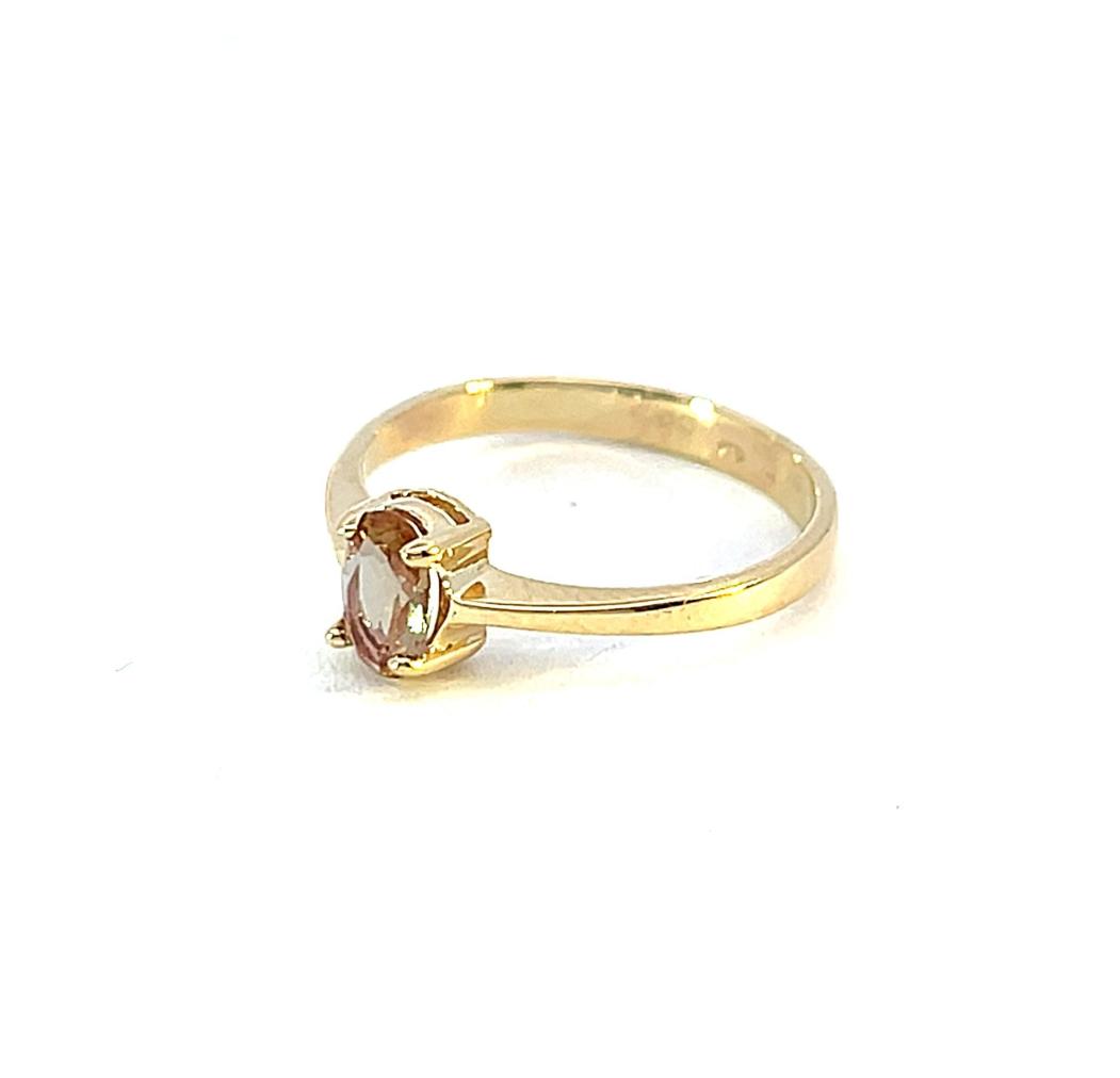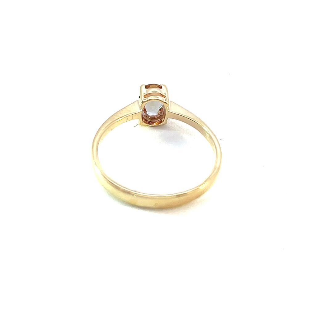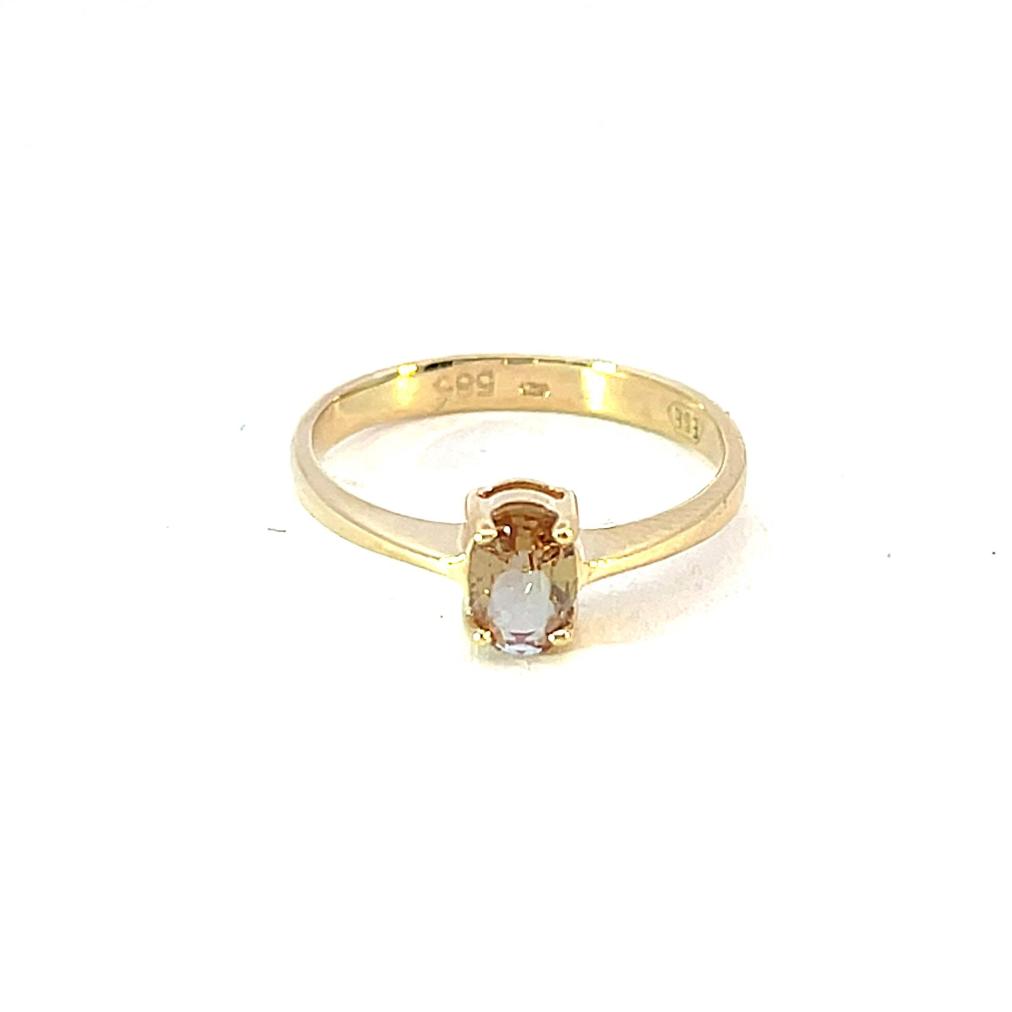 Zlatý prsten o ryzosti 585/1000, punc labuť. Váha 1,60 g, velikost 50, v nejširším bodě 6 mm. Kámen je syntetický.