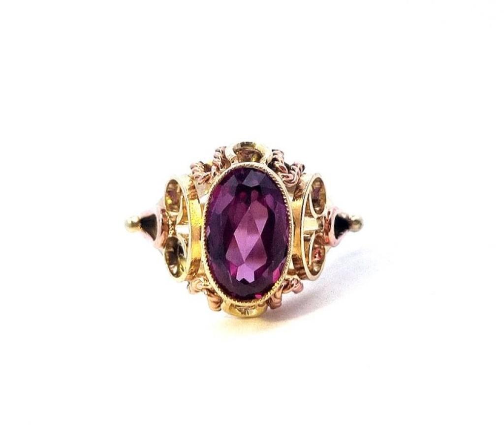 Zlatý prsten s ametystem, vel. 51. Ryzost 585/1000, punc čejka. Váha 3,83 g, rozměry hlavy prstenu 15 x 16 mm. Kámen je syntetický.