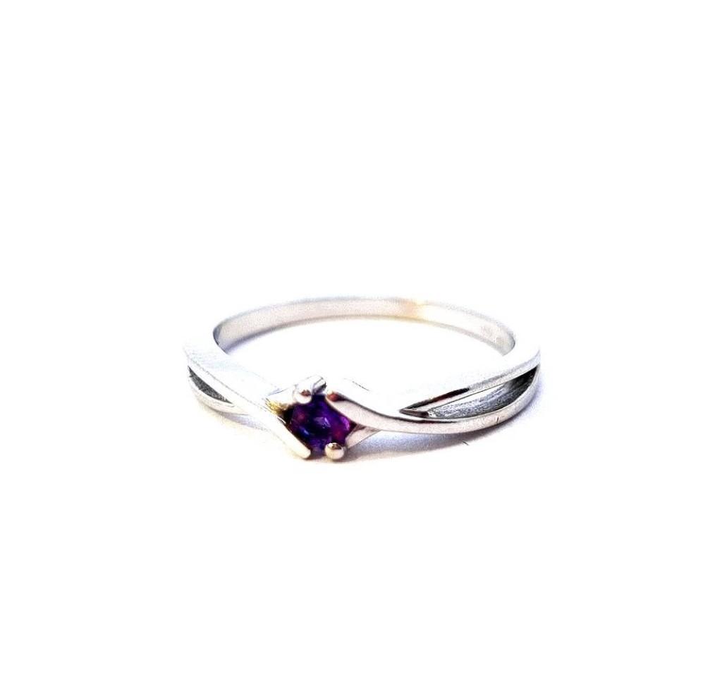 Prsten z bílého zlata o ryzosti 585/1000, punc labuť. Váha 2,10 g, velikost 53, v nejširším bodě 4 mm. Kámen - přírodní ametyst - celkem 1 ks, cca 0,1 ct.