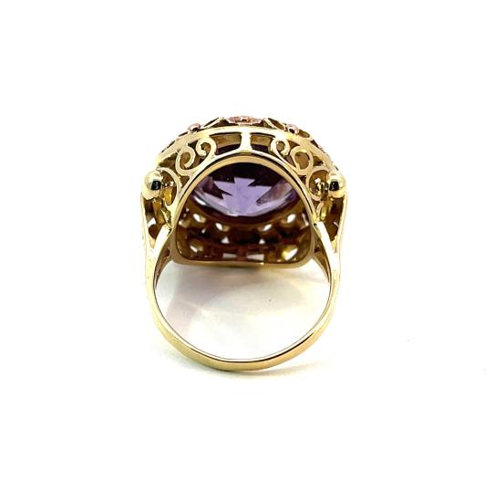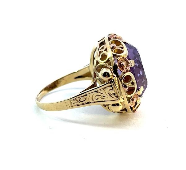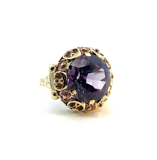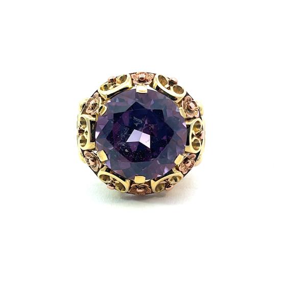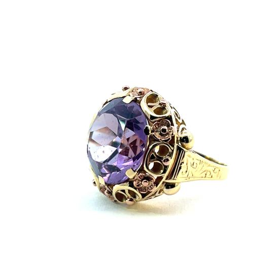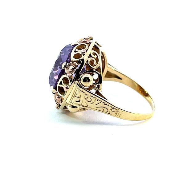 Zlatý prsten o ryzosti 585/1000, punc labuť. Váha 11,63 g, velikost 57, průměr hlavy prstenu 21 mm. Kámen je syntetický.