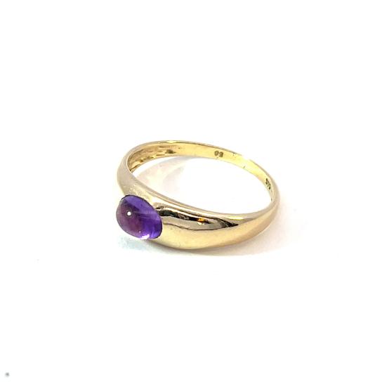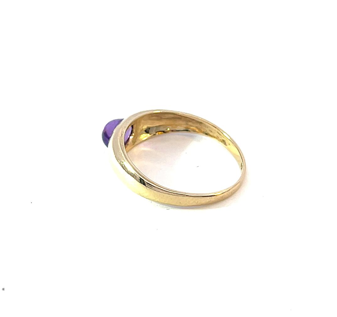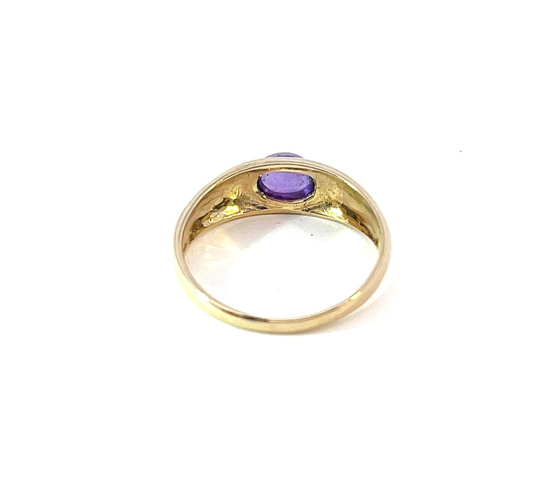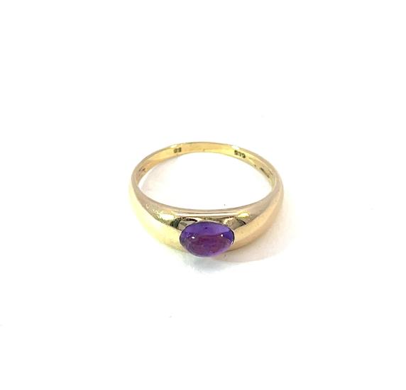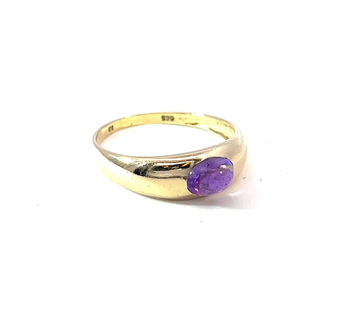 Zlatý prsten o ryzosti 585/1000, punc labuť. Velikost 57, váha 2,47 g, v nejširším bodě 6 mm. Kámen je syntetický.
