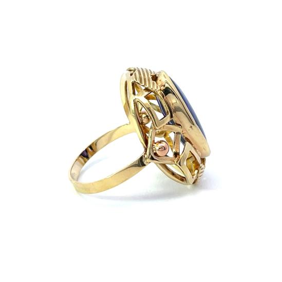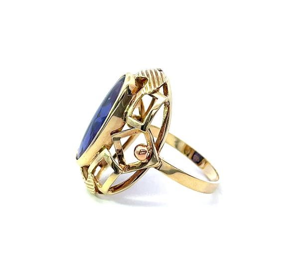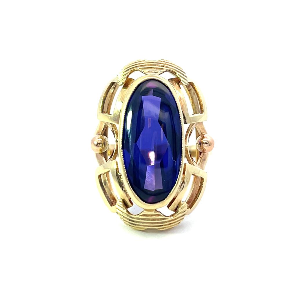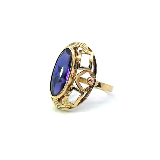 Prsten z kombinace žlutého a růžového zlata o ryzosti 585/1000, punc čejka. Váha 7,06 g, velikost 58, rozměr hlavy prstenu 26 x 19 mm, rozměr kamene 20 x 10 mm. Kámen je syntetický a má fialový odstín, barva na fotce zkresluje.