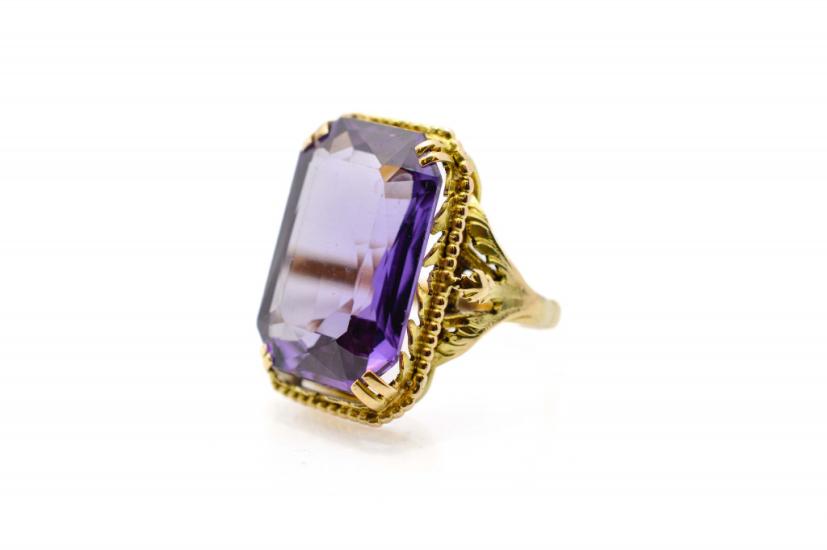 Zlatý prsten o ryzosti 585/1000, punc čejka. Velikost 54, váha 8,28g. Rozměr hlavy prstenu je 22x15mm.